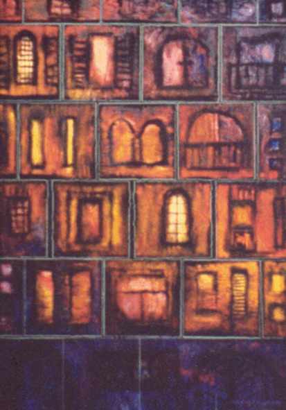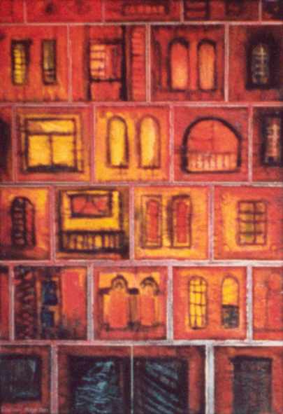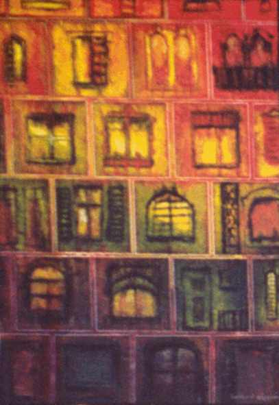 Bei diesen Bildern werden Zettelkastenpapiere zum Collagieren verwendet. Nur werden diese steng in Waagerechten und Senkrechten ausgerichtet und geklebt, um das “Gerüst” für eine Häuserfassade, einen Hinterhof oder inen Palast zu liefern. Nach dem massiven Übermalen mit Acrylfarben werden dann direkt in den “Farbensumpf” die Details ( Fenster, Türen, Balkone, Geländer, Lampen usw. ) mit feinem Pinsel gezeichnet, um die Szenerie zu gespenstisch, geheimnisvollem Leben zu erwecken. Was mag hinter jedem dieser Fenster vorgehen? Fast wird man ein wenig an die “Cast- Iron- Houses” ( Fassaden aus gußeisernen Fertigteilen ) im New Yorker Künstlerviertel SOHO erinnert.