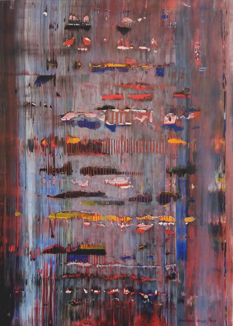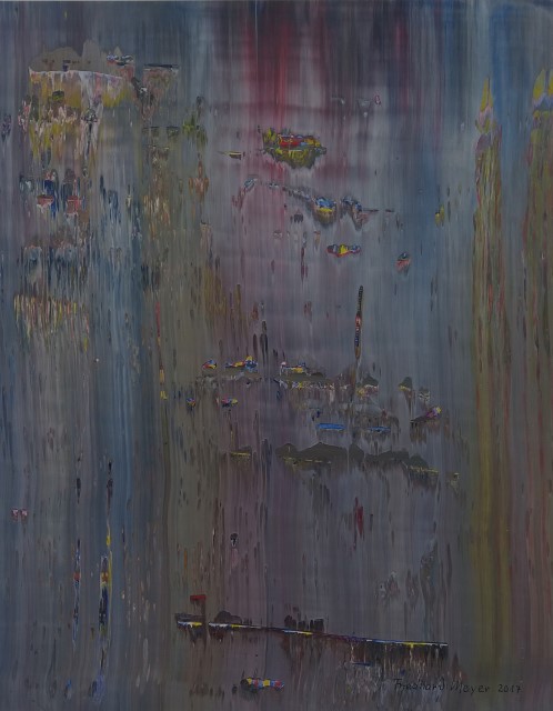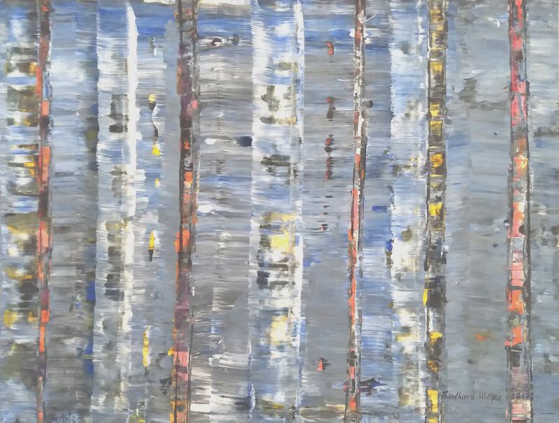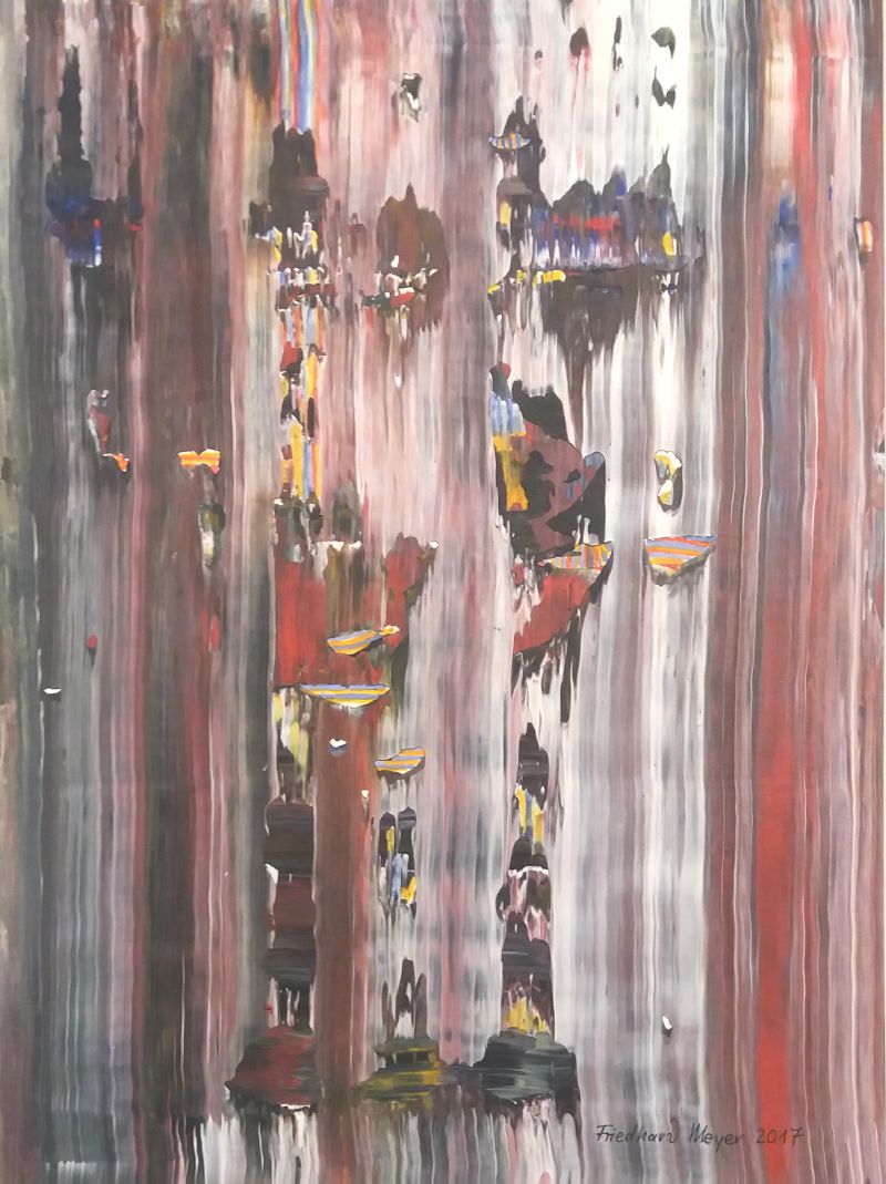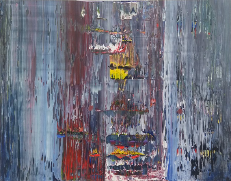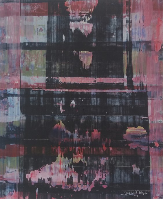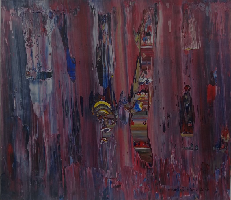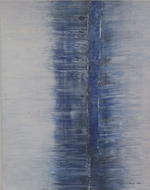 Seit 1993 beschäftige ich mich mit großformatigen Abstraktionen. Dabei werden dünnflüssige Acrylfarben durch Träufeln, Gießen oder Schütten auf den Bildträger aufgebracht. Die Bildgestaltung wird bei diesen Bildern nicht einseitig von der vorgegebenen und unverrückbaren Bildidee erzwungen. Vielmehr stehen Bildidee und Bildgestaltung in gegenseitiger Abhängigkeit. Während des Arbeitsprozesses entstehen z.B. neue Bildideen, die dann durch geeignete Farb- und Formwahl im weiteren Arbeitsverlauf realisiert werden. Die Entstehung des Bildes vollzieht sich sozusagen in einer stufenweise fortschreitenden Wechselwirkung zwischen Bildgestaltung und Bildidee. In jüngerer Zeit entstehen diese Bilder in der Technik „Die Farbe Weiß", ab 2013 vornehmlich in Acryl-Rakeltechnik.