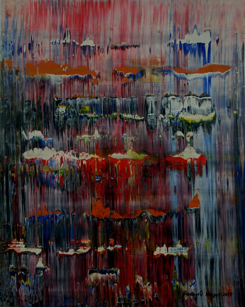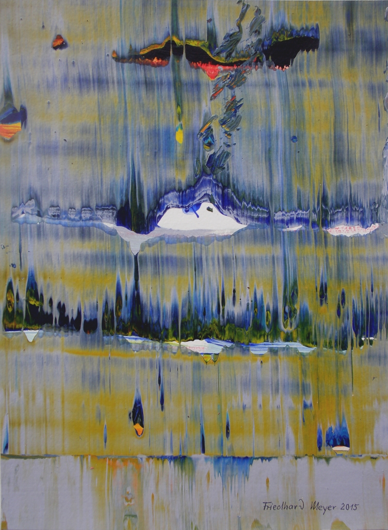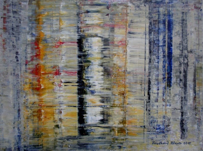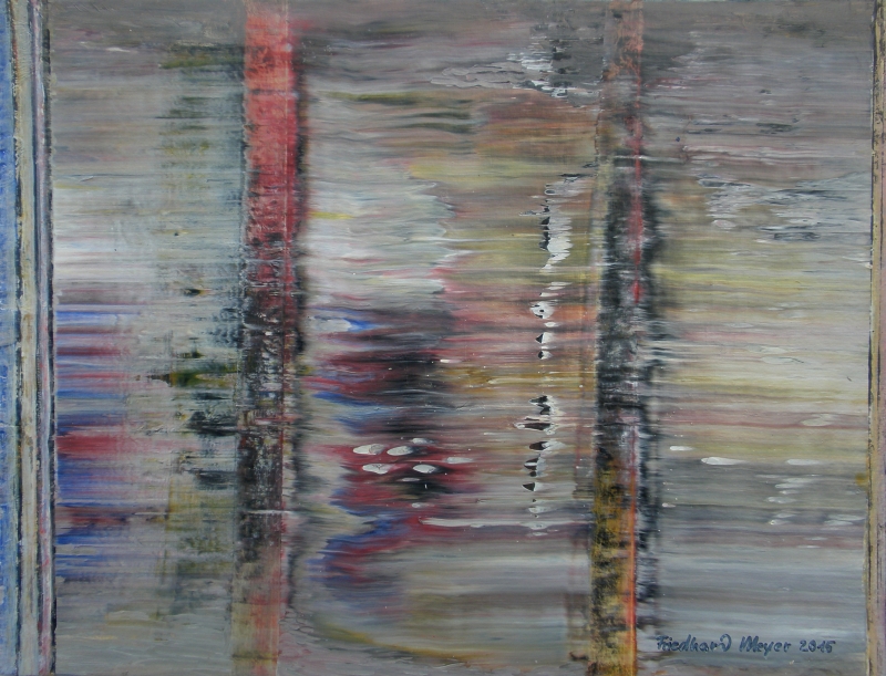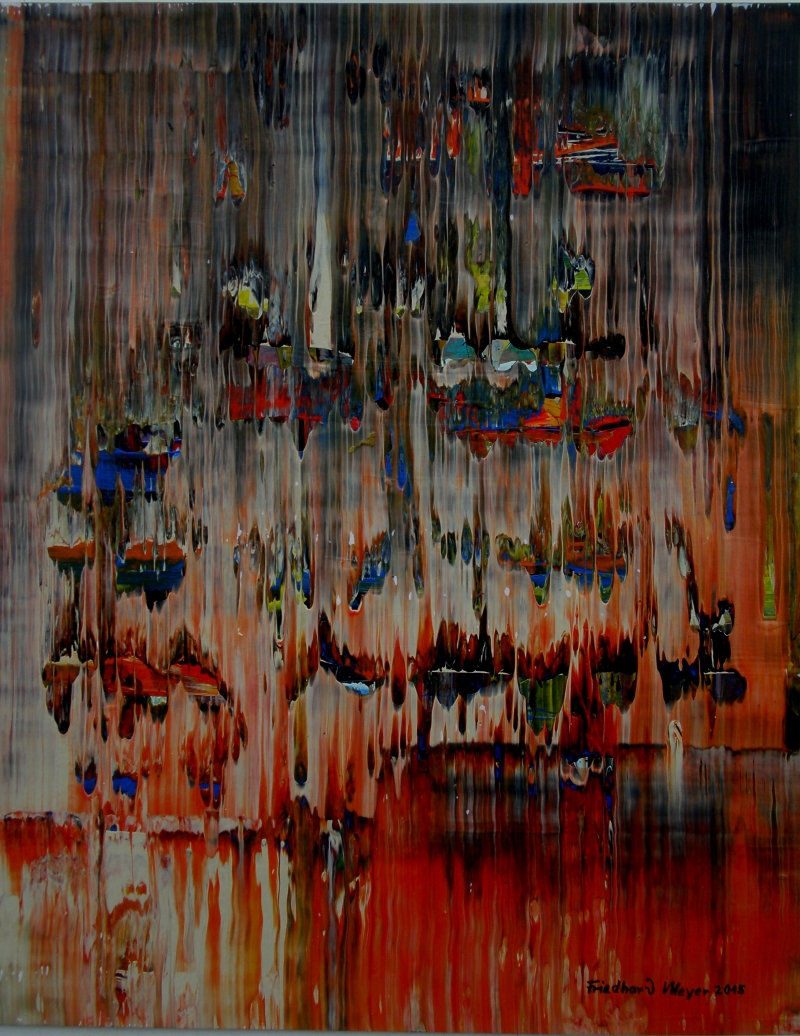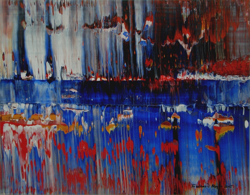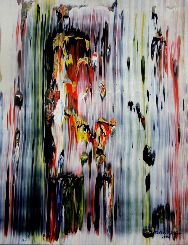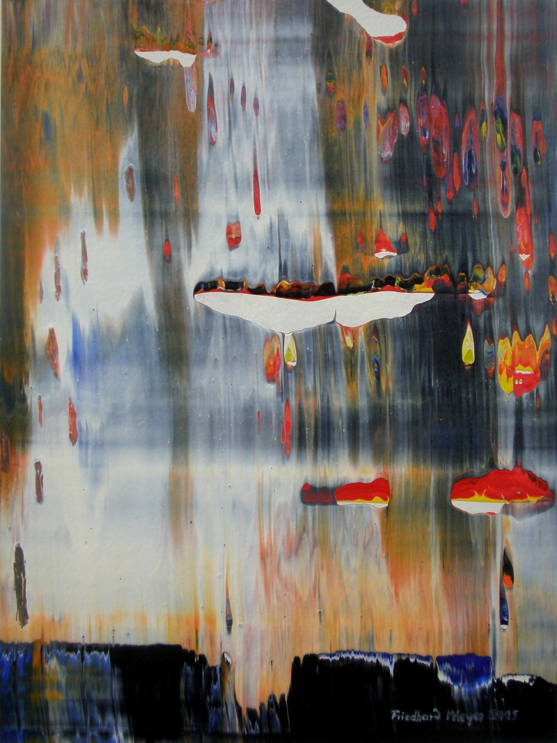 Seit 1993 beschäftige ich mich mit großformatigen Abstraktionen. Dabei werden dünnflüssige Acrylfarben durch Träufeln, Gießen oder Schütten auf den Bildträger aufgebracht. Die Bildgestaltung wird bei diesen Bildern nicht einseitig von der vorgegebenen und unverrückbaren Bildidee erzwungen. Vielmehr stehen Bildidee und Bildgestaltung in gegenseitiger Abhängigkeit. Während des Arbeitsprozesses entstehen z.B. neue Bildideen, die dann durch geeignete Farb- und Formwahl im weiteren Arbeitsverlauf realisiert werden. Die Entstehung des Bildes vollzieht sich sozusagen in einer stufenweise fortschreitenden Wechselwirkung zwischen Bildgestaltung und Bildidee. In jüngerer Zeit entstehen diese Bilder in der Technik „Die Farbe Weiß", ab 2013 vornehmlich in Acryl-Rakeltechnik.