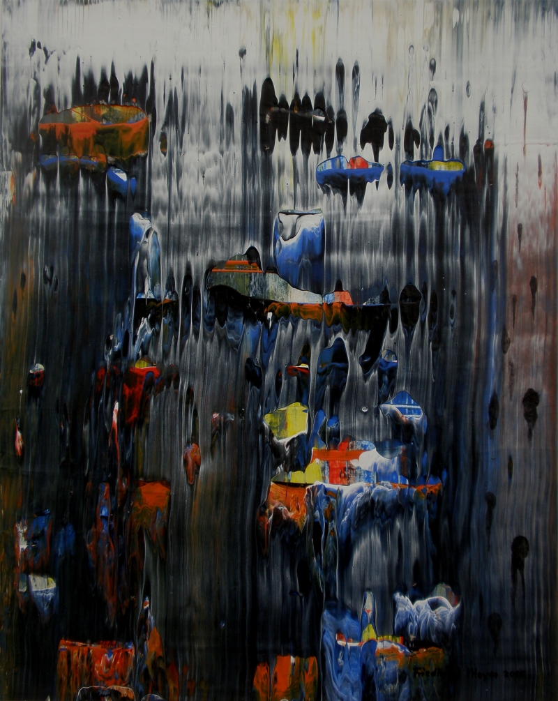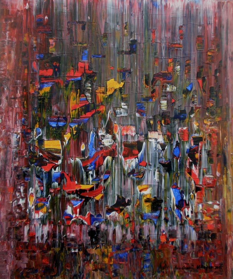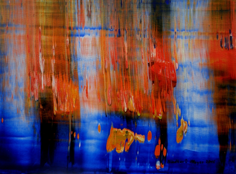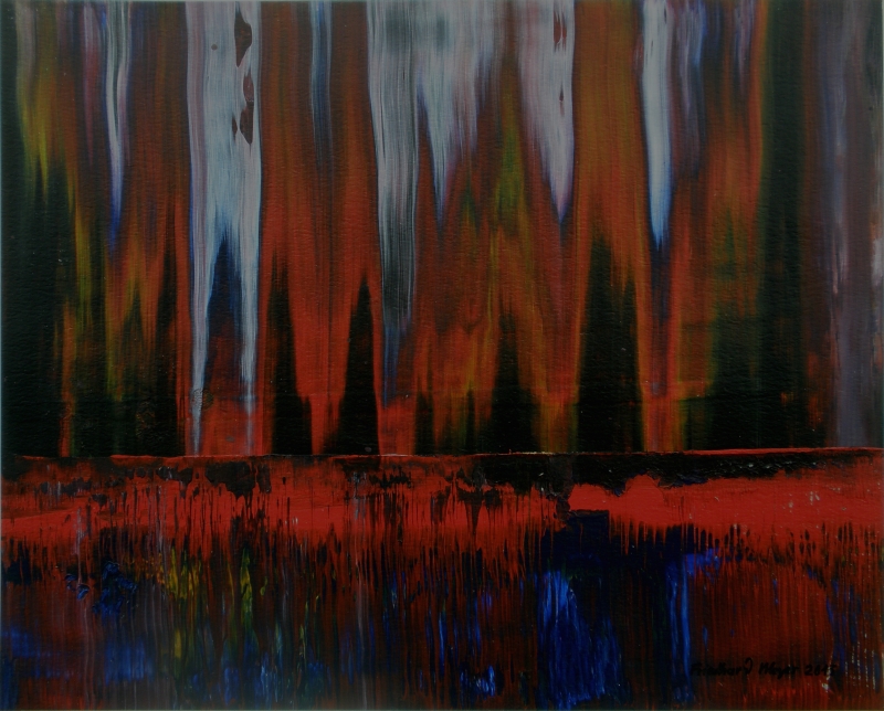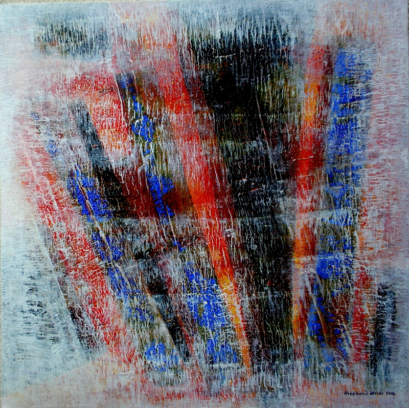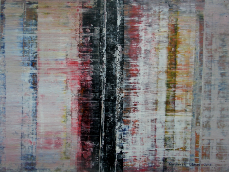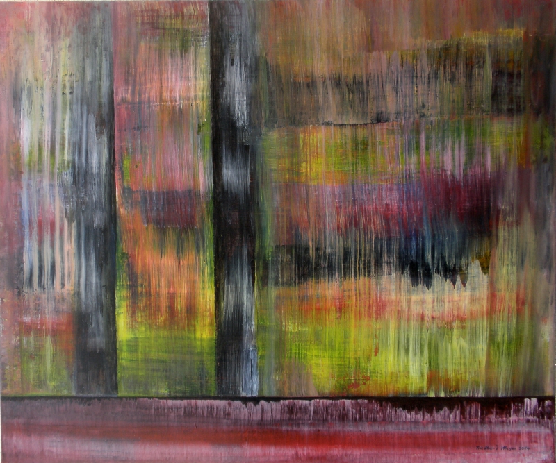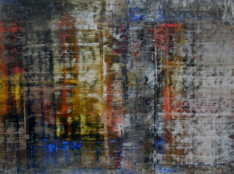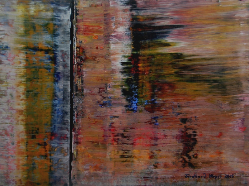 Seit 1993 beschäftige ich mich mit großformatigen Abstraktionen. Dabei werden dünnflüssige Acrylfarben durch Träufeln, Gießen oder Schütten auf den Bildträger aufgebracht. Die Bildgestaltung wird bei diesen Bildern nicht einseitig von der vorgegebenen und unverrückbaren Bildidee erzwungen. Vielmehr stehen Bildidee und Bildgestaltung in gegenseitiger Abhängigkeit. Während des Arbeitsprozesses entstehen z.B. neue Bildideen, die dann durch geeignete Farb- und Formwahl im weiteren Arbeitsverlauf realisiert werden. Die Entstehung des Bildes vollzieht sich sozusagen in einer stufenweise fortschreitenden Wechselwirkung zwischen Bildgestaltung und Bildidee. In jüngerer Zeit entstehen diese Bilder in der Technik „Die Farbe Weiß", ab 2013 vornehmlich in Acryl-Rakeltechnik.