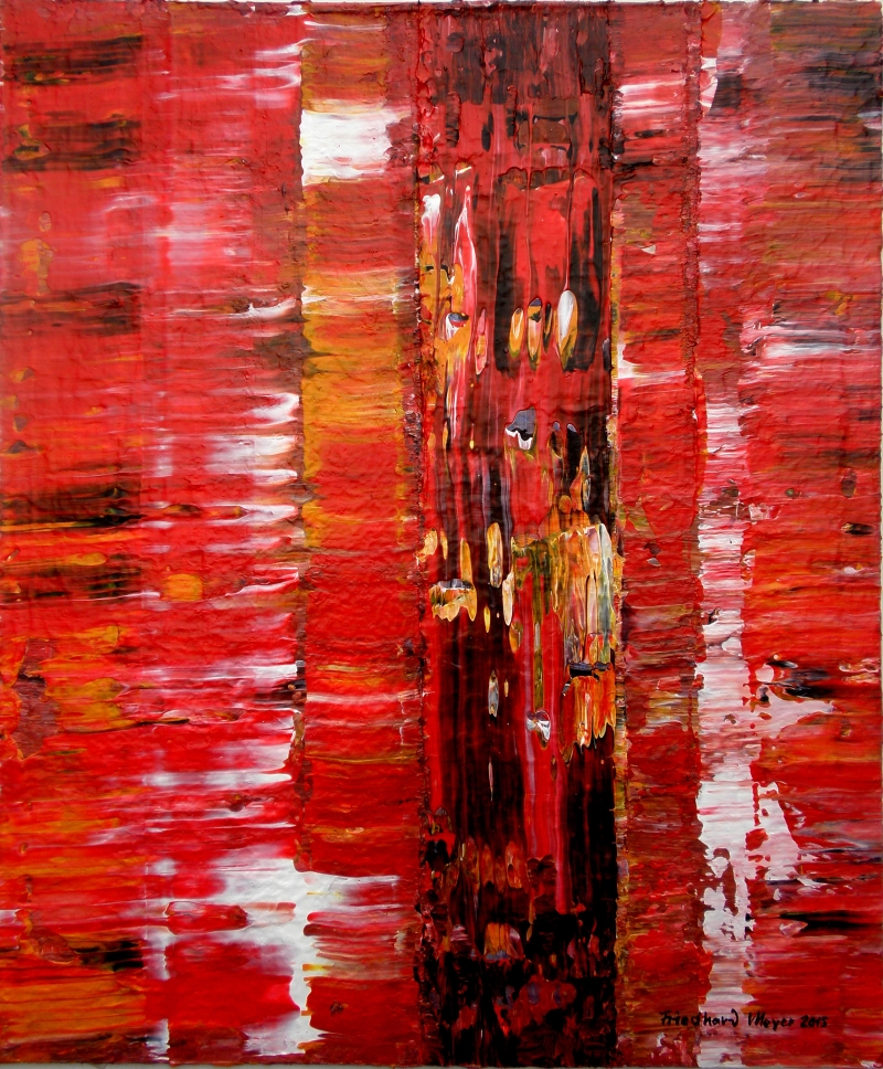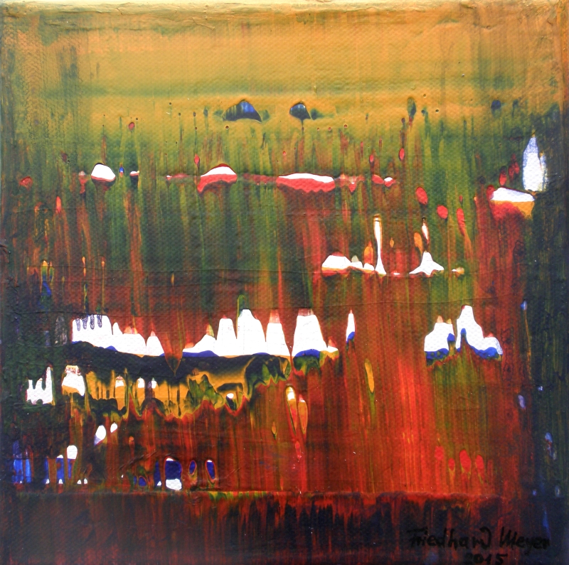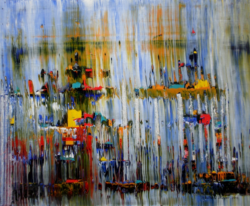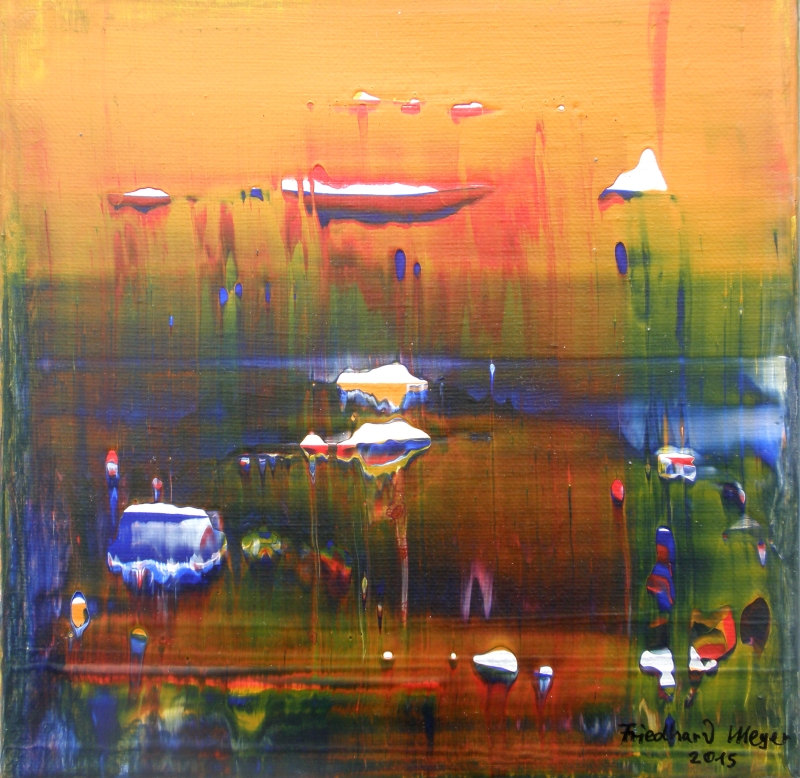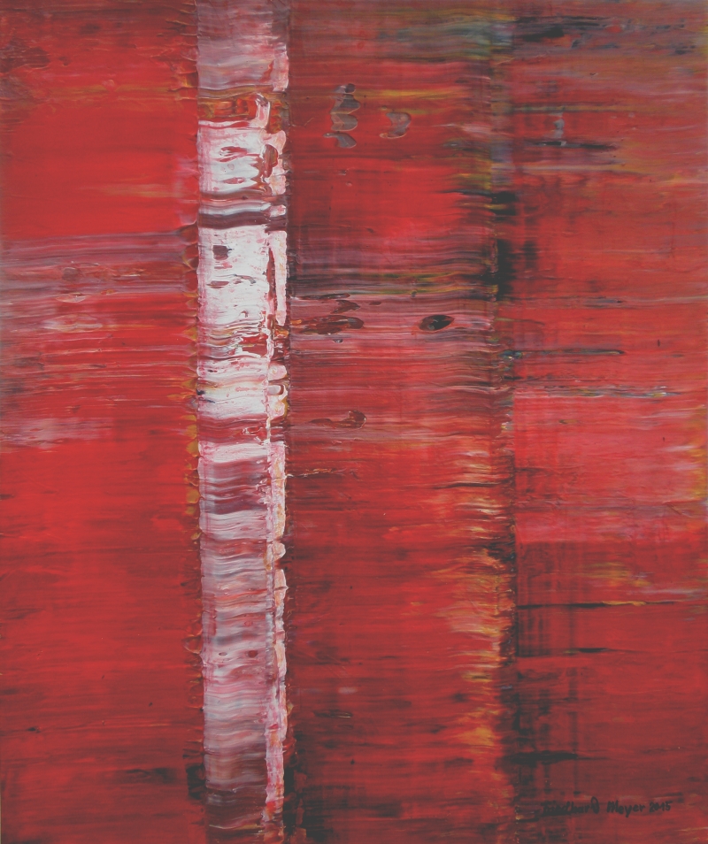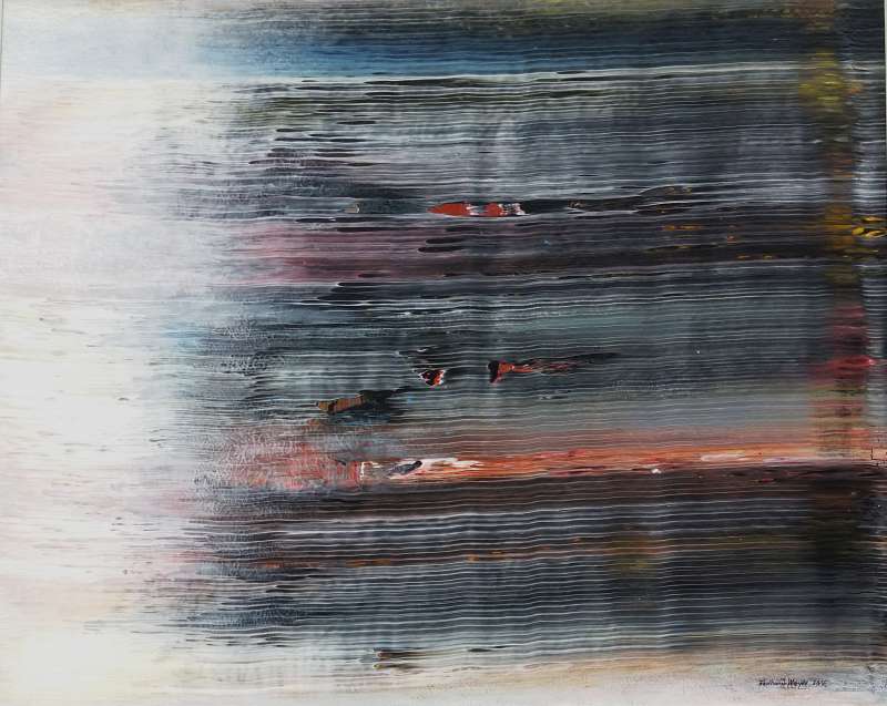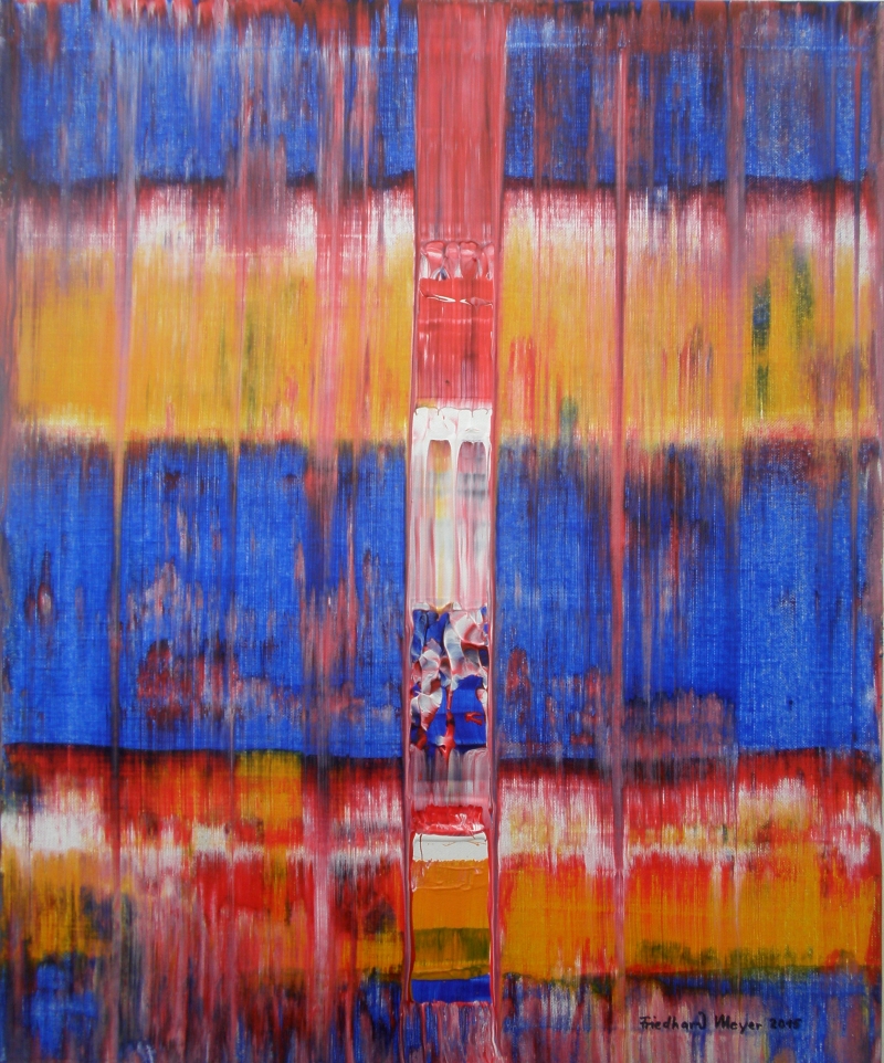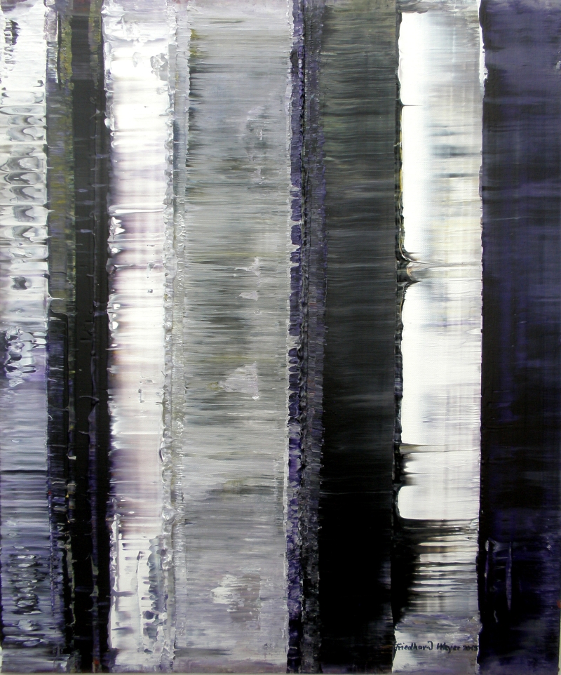 Seit 1993 beschäftige ich mich mit großformatigen Abstraktionen. Dabei werden dünnflüssige Acrylfarben durch Träufeln, Gießen oder Schütten auf den Bildträger aufgebracht. Die Bildgestaltung wird bei diesen Bildern nicht einseitig von der vorgegebenen und unverrückbaren Bildidee erzwungen. Vielmehr stehen Bildidee und Bildgestaltung in gegenseitiger Abhängigkeit. Während des Arbeitsprozesses entstehen z.B. neue Bildideen, die dann durch geeignete Farb- und Formwahl im weiteren Arbeitsverlauf realisiert werden. Die Entstehung des Bildes vollzieht sich sozusagen in einer stufenweise fortschreitenden Wechselwirkung zwischen Bildgestaltung und Bildidee. In jüngerer Zeit entstehen diese Bilder in der Technik „Die Farbe Weiß", ab 2013 vornehmlich in Acryl-Rakeltechnik.