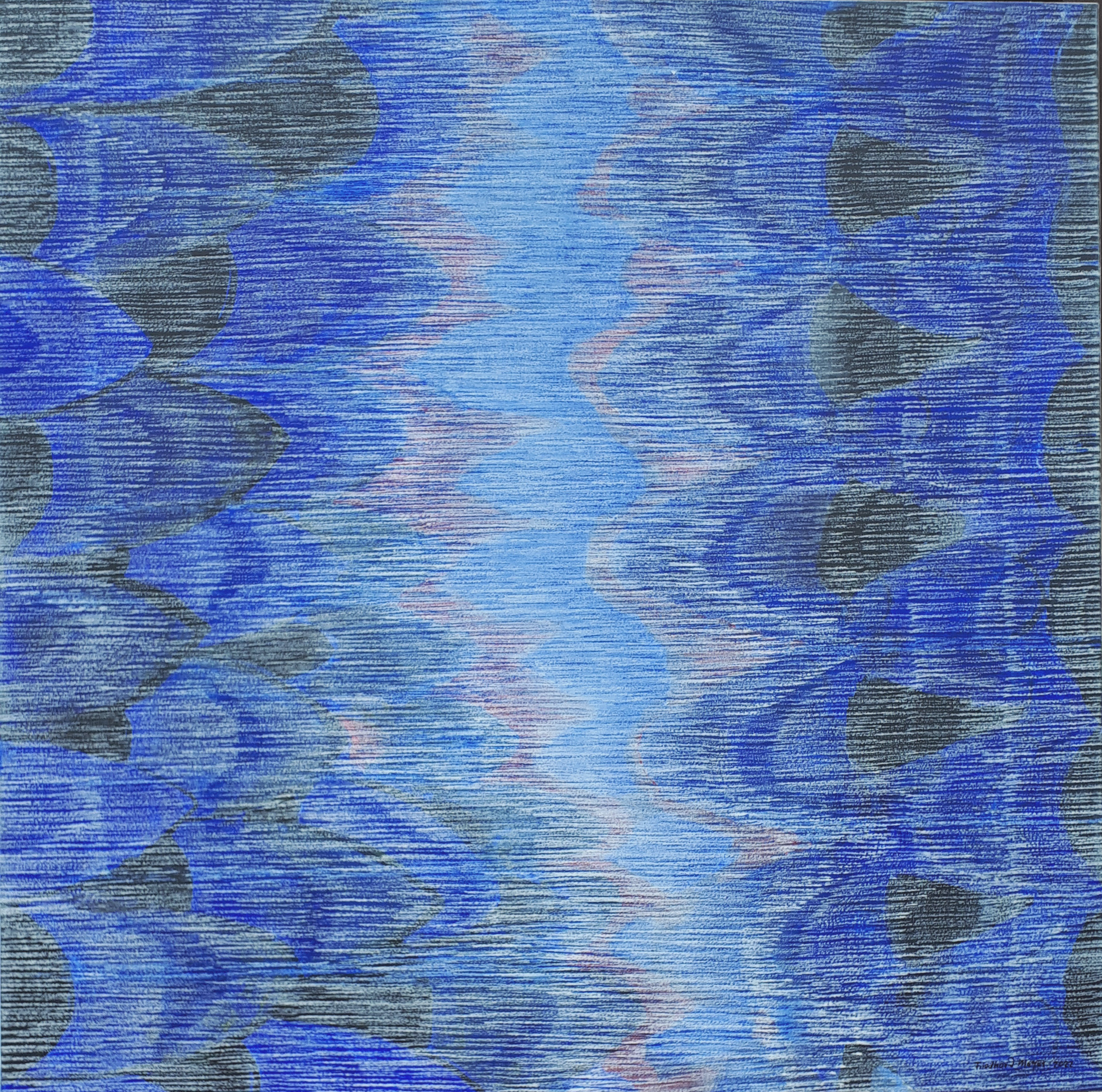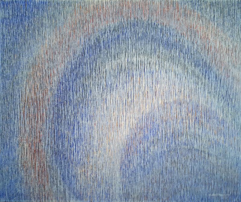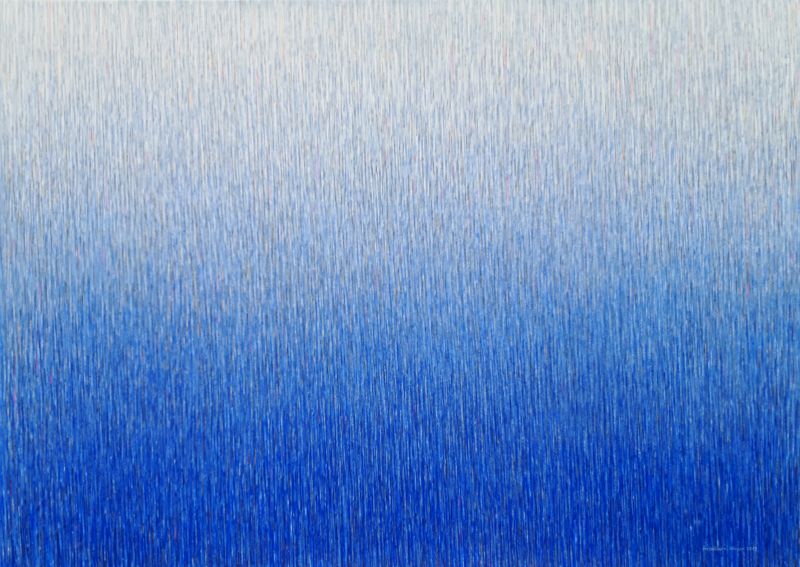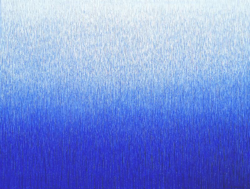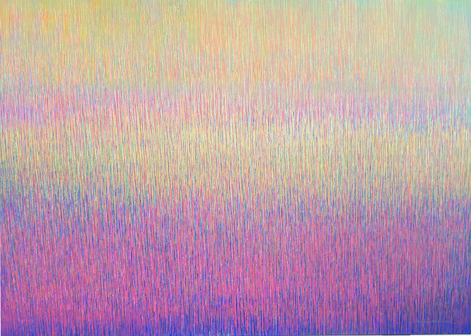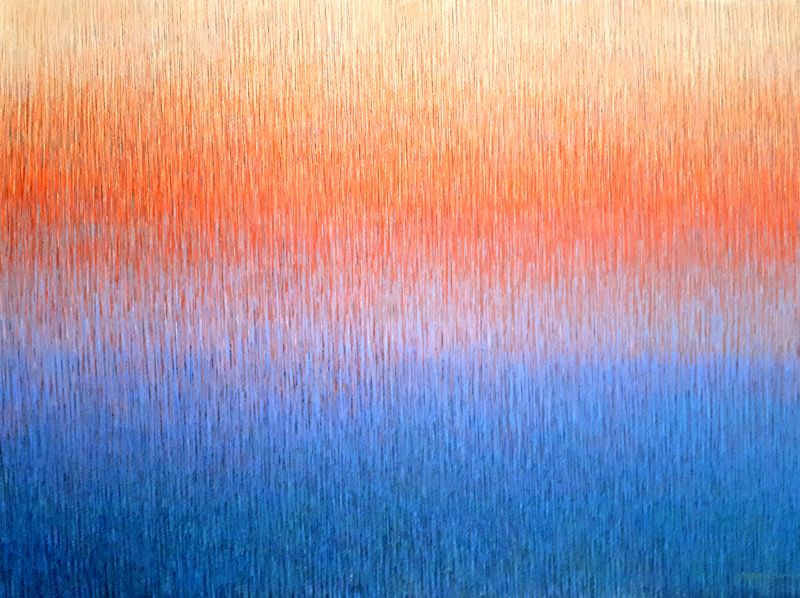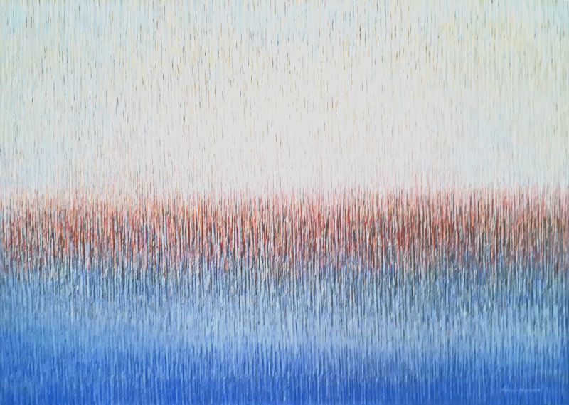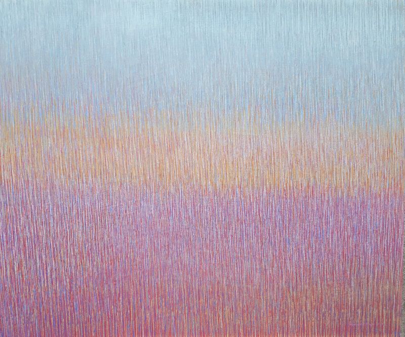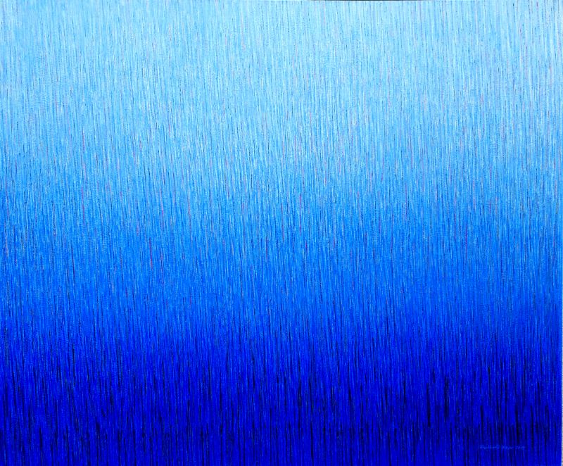 Ich arbeite bei diesen Bildern in meiner selbstentwickelten Acryl-Nadeltechnik, wobei meine Bildflächen einzig durch vertikales Aufsetzen eines 8 cm breiten Flachpinsels erzeugt werden. Das Aufbringen dieser „Nadeln“ erfordert äußerste Konzentration und Präzision.