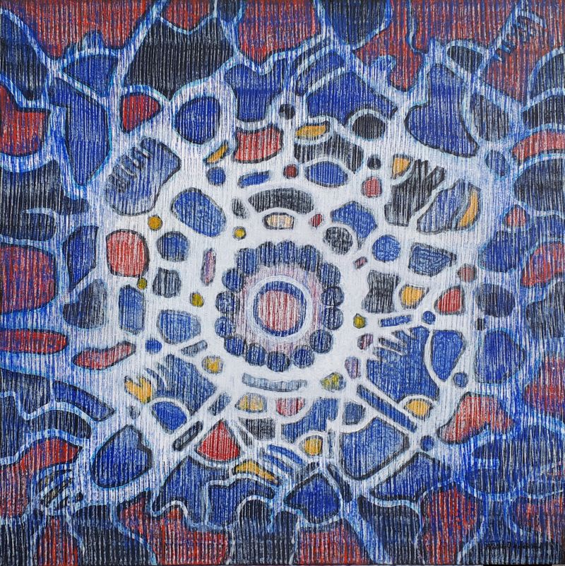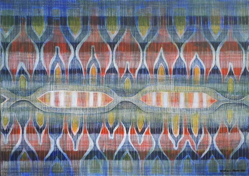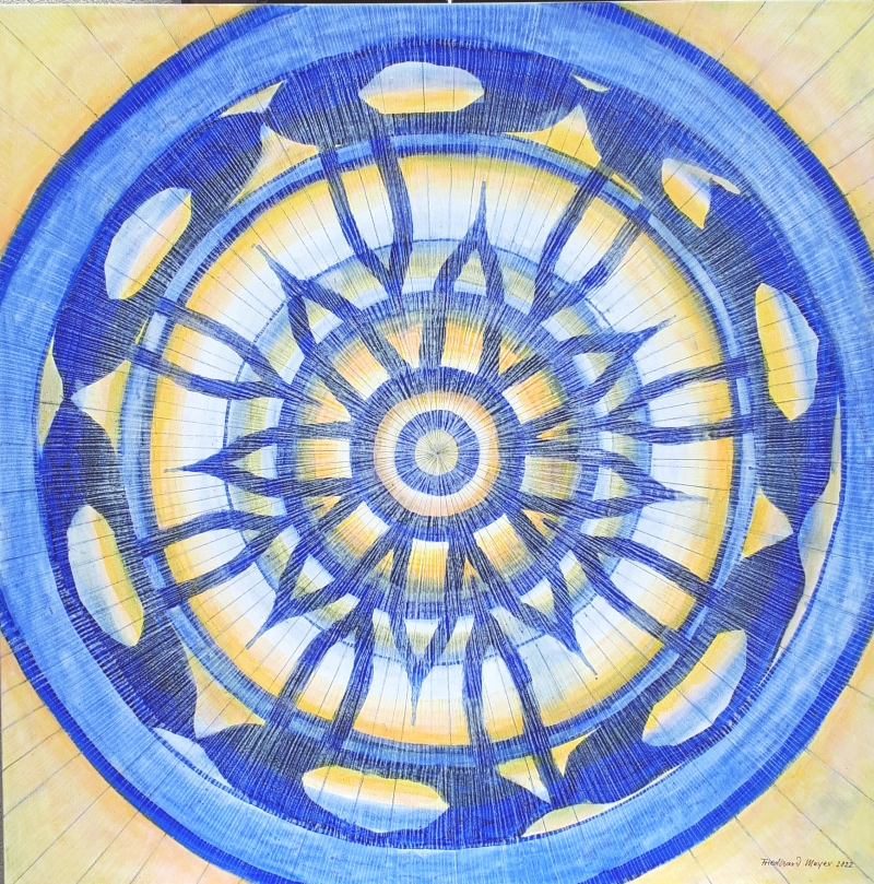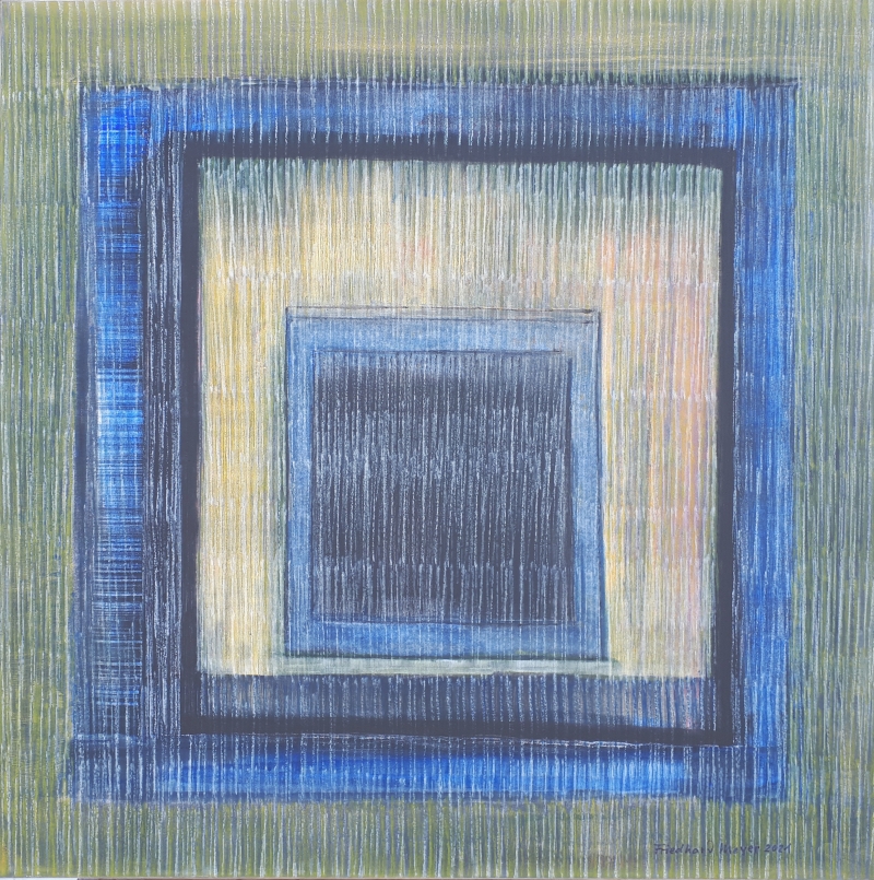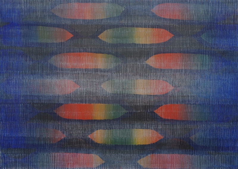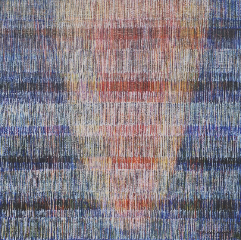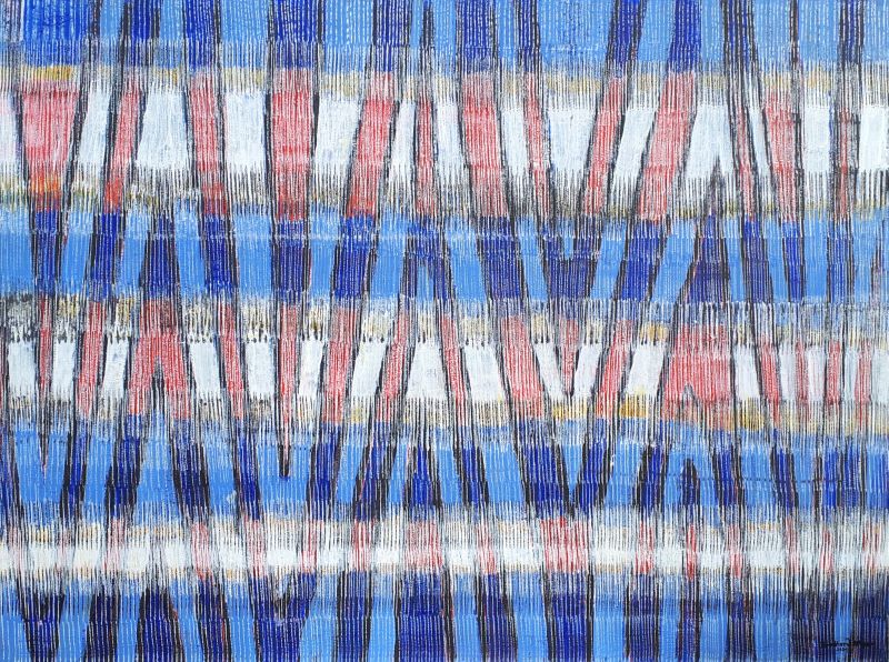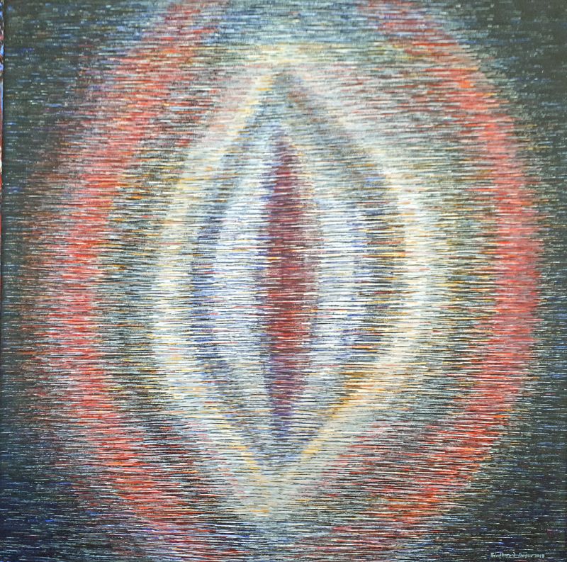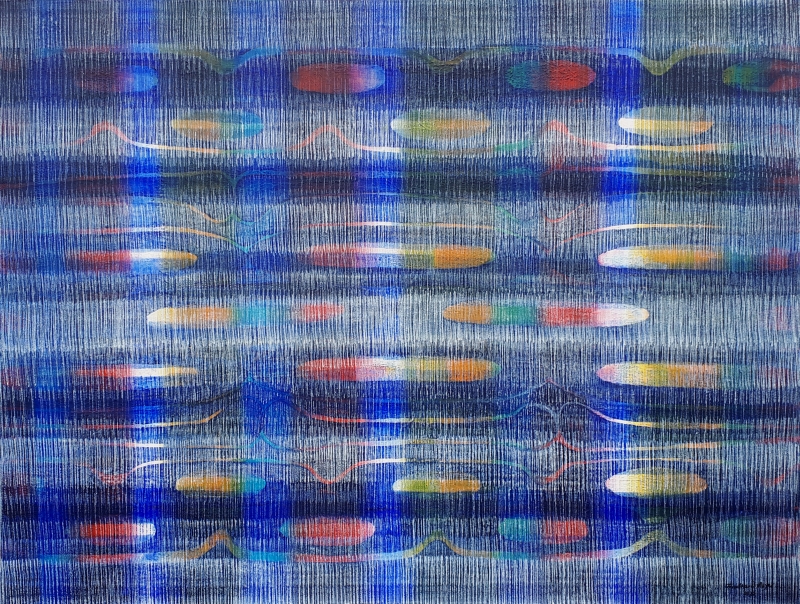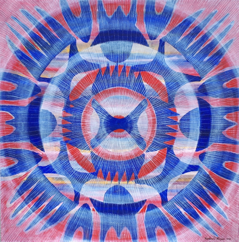 Ich arbeite bei diesen Bildern in meiner selbstentwickelten Acryl-Nadeltechnik, wobei meine Bildflächen einzig durch vertikales Aufsetzen eines 8 cm breiten Flachpinsels erzeugt werden. Das Aufbringen dieser „Nadeln“ erfordert äußerste Konzentration und Präzision.