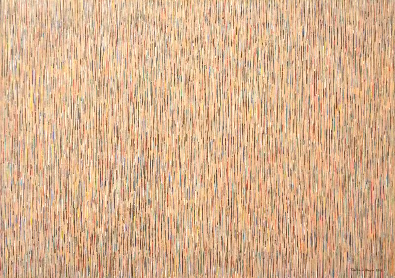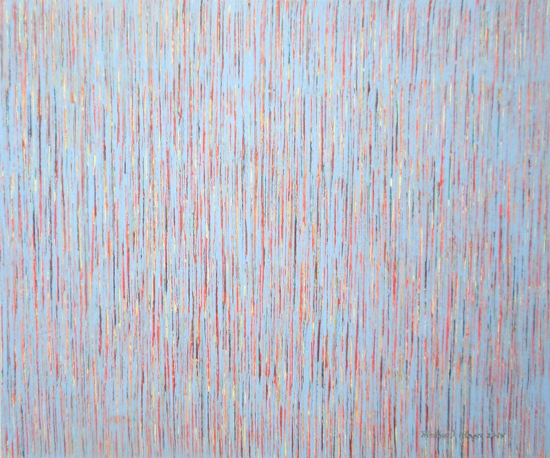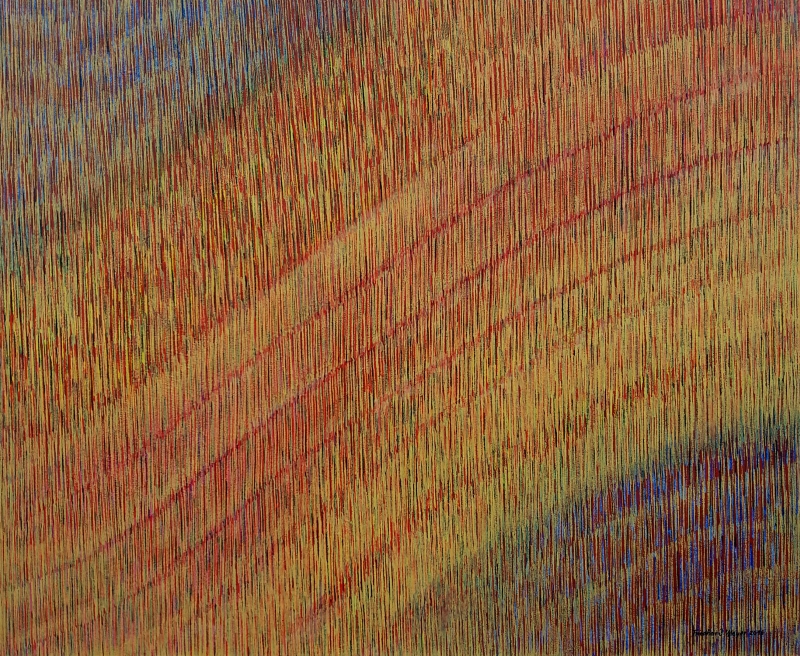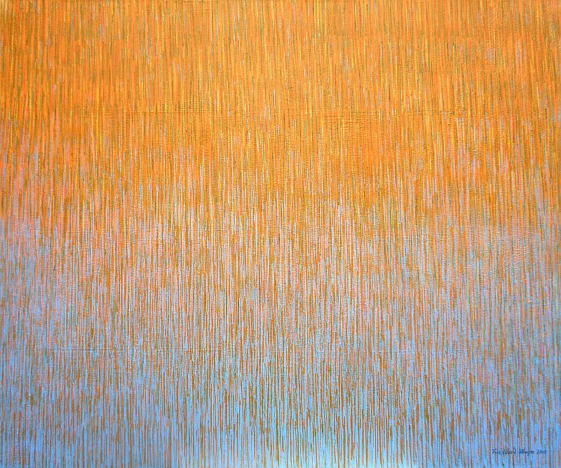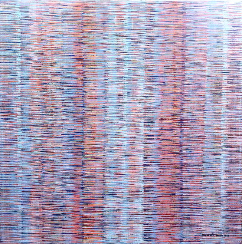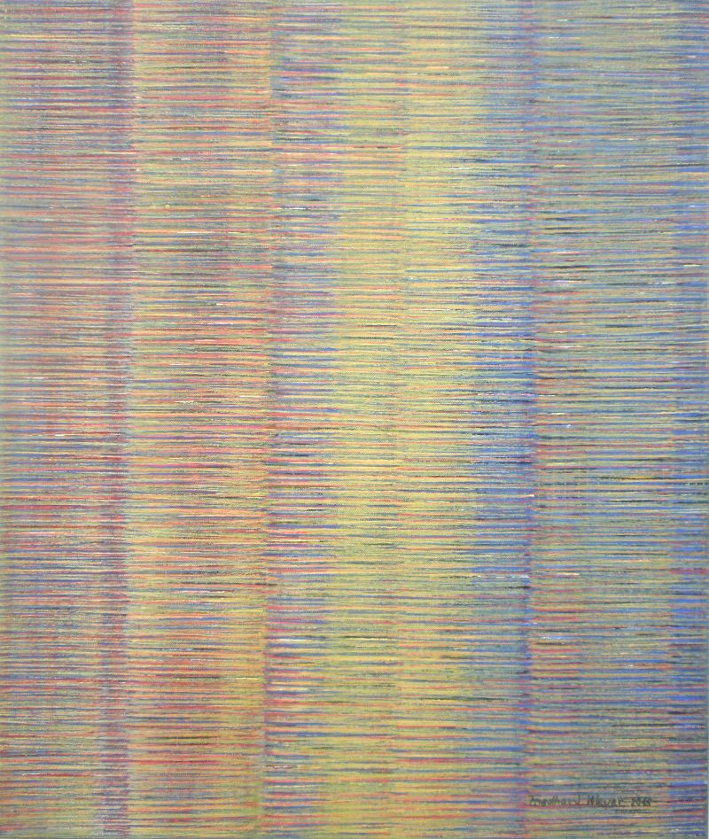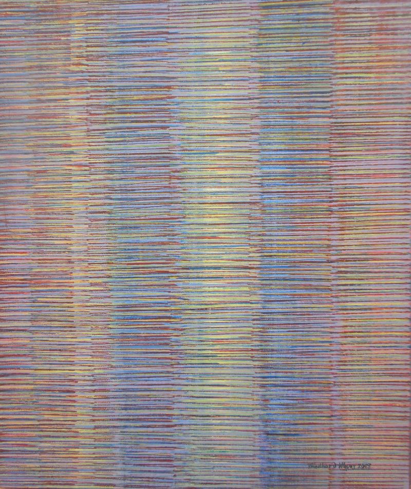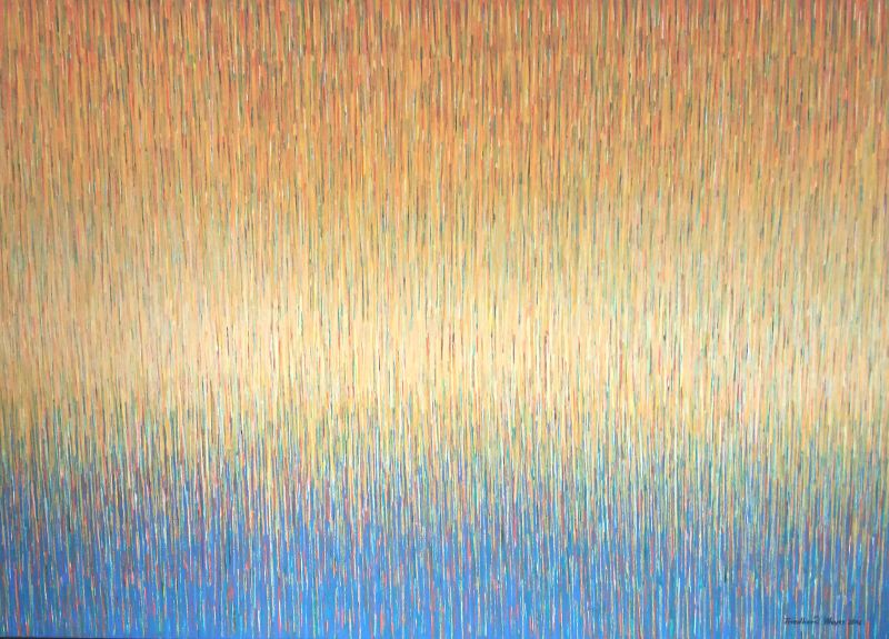 Ich arbeite bei diesen Bildern in meiner selbstentwickelten Acryl-Nadeltechnik, wobei meine Bildflächen einzig durch vertikales Aufsetzen eines 8 cm breiten Flachpinsels erzeugt werden. Das Aufbringen dieser „Nadeln“ erfordert äußerste Konzentration und Präzision.
