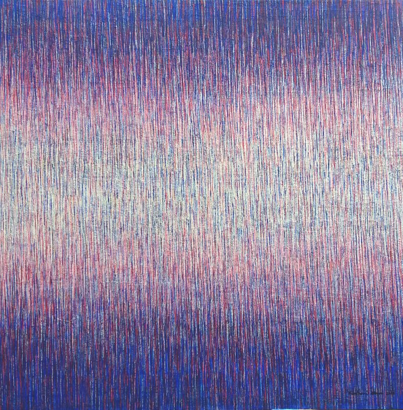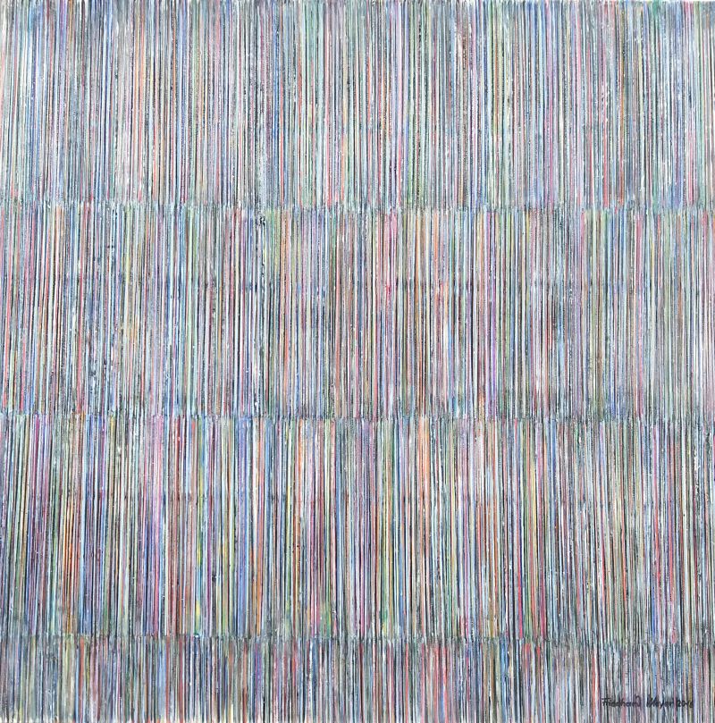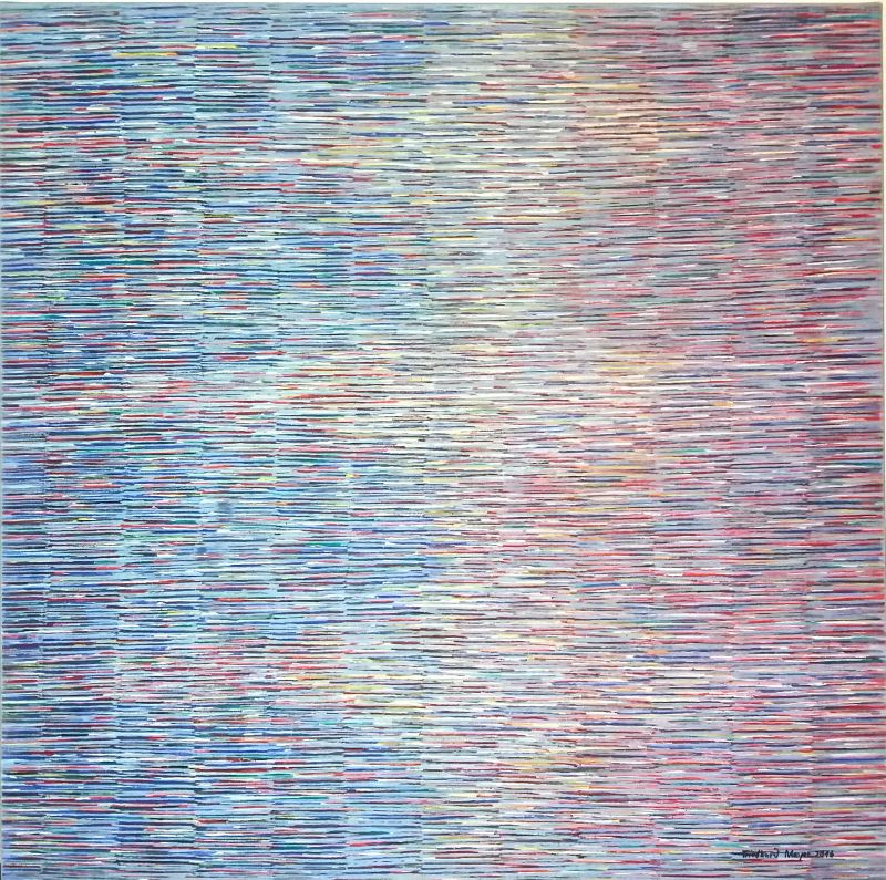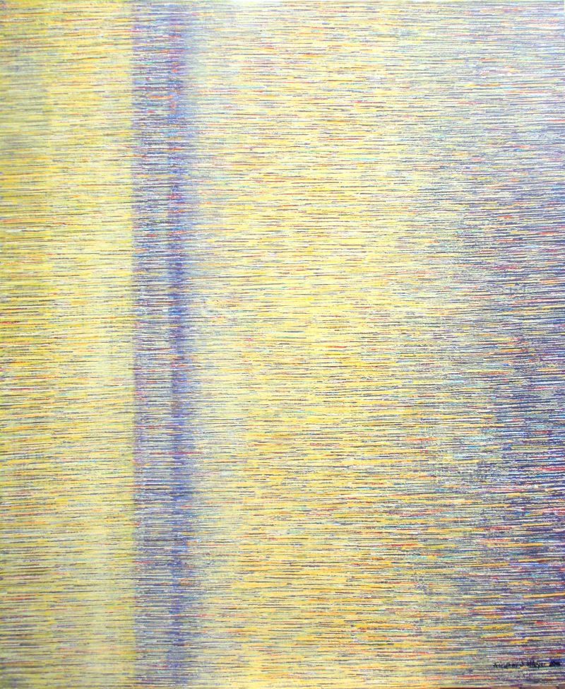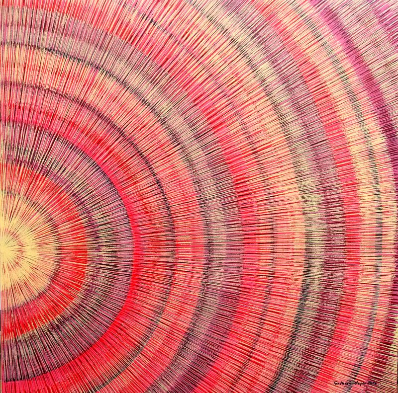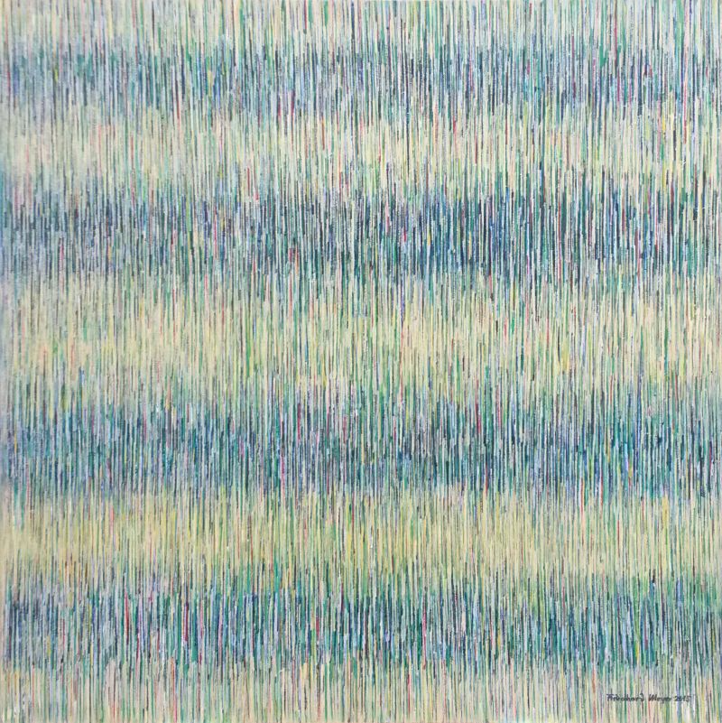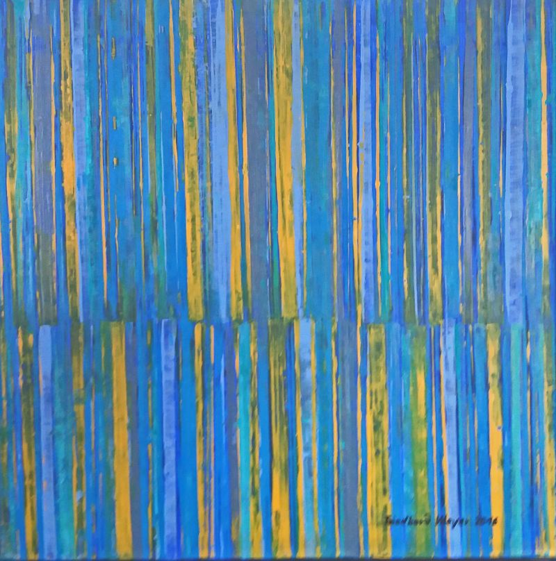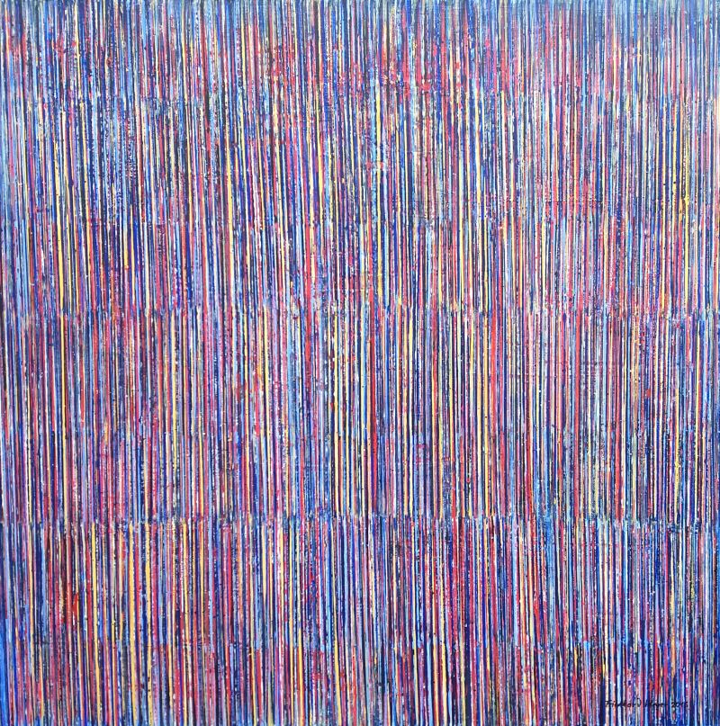 Ich arbeite bei diesen Bildern in meiner selbstentwickelten Acryl-Nadeltechnik, wobei meine Bildflächen einzig durch vertikales Aufsetzen eines 8 cm breiten Flachpinsels erzeugt werden. Das Aufbringen dieser „Nadeln“ erfordert äußerste Konzentration und Präzision.