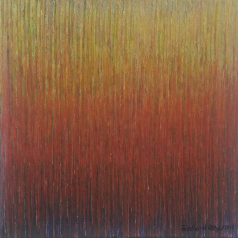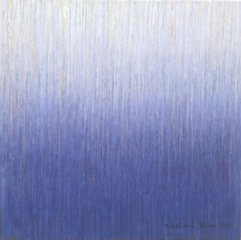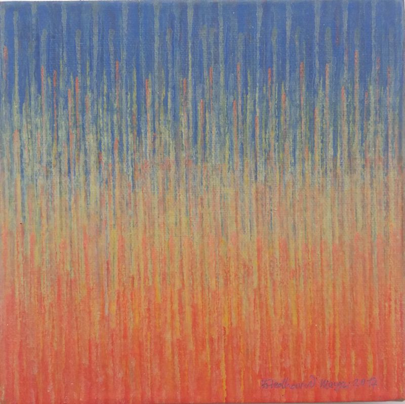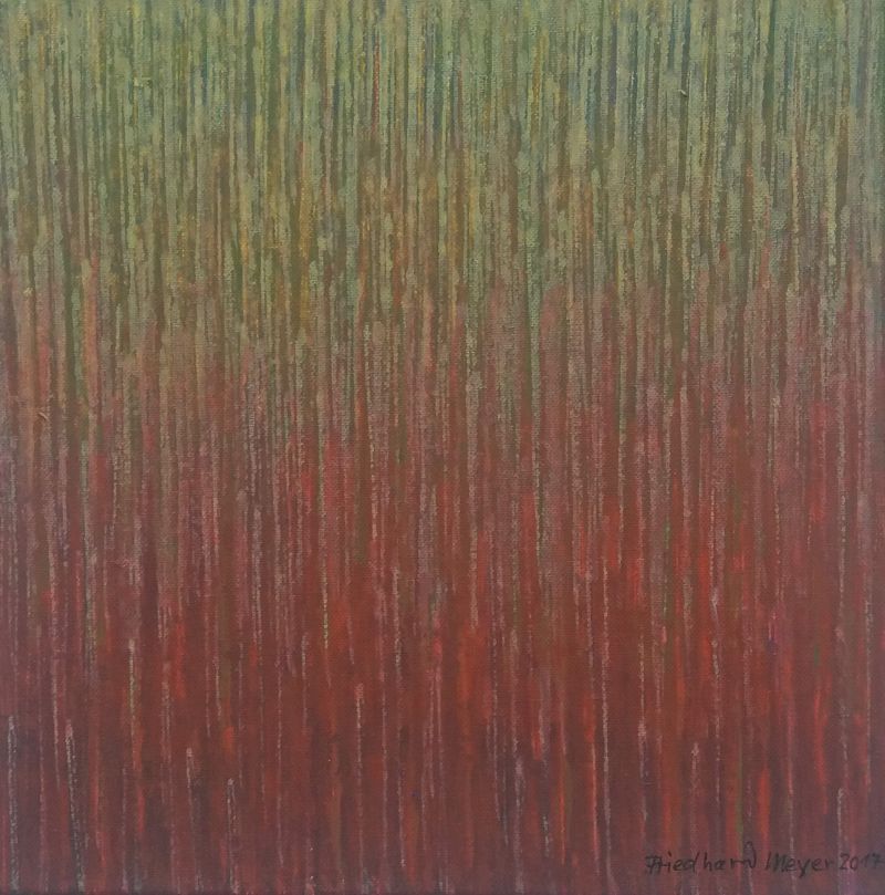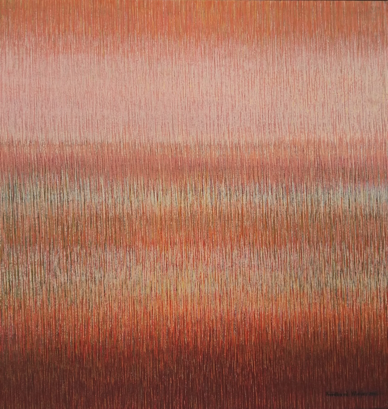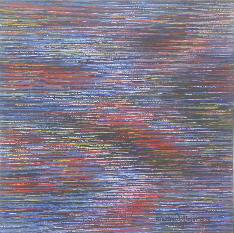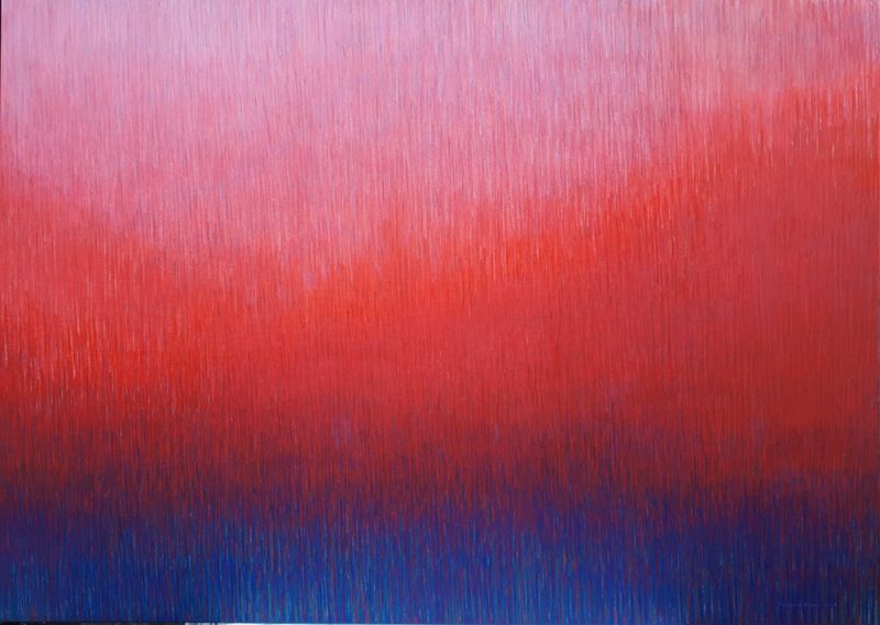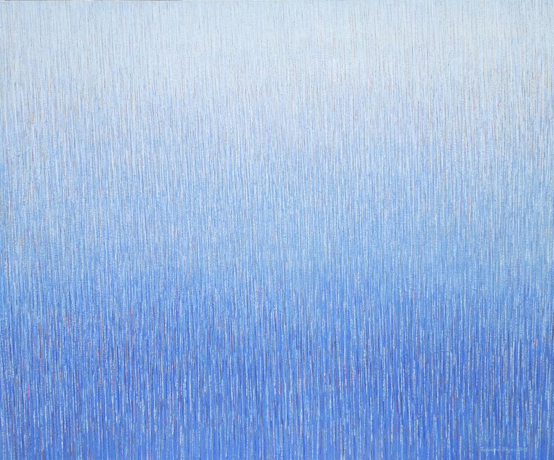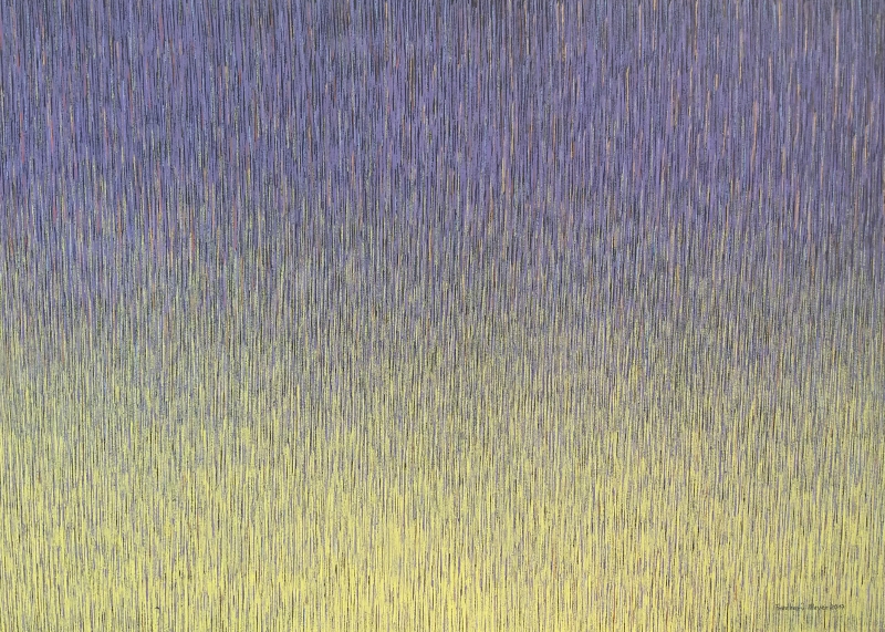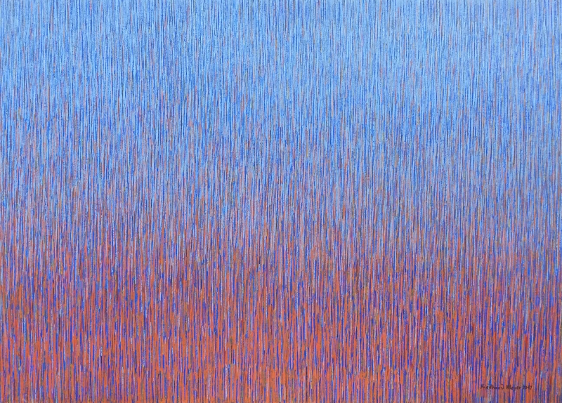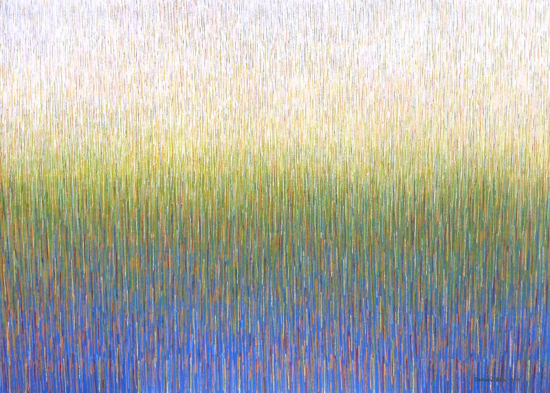 Ich arbeite bei diesen Bildern in meiner selbstentwickelten Acryl-Nadeltechnik, wobei meine Bildflächen einzig durch vertikales Aufsetzen eines 8 cm breiten Flachpinsels erzeugt werden. Das Aufbringen dieser „Nadeln“ erfordert äußerste Konzentration und Präzision.