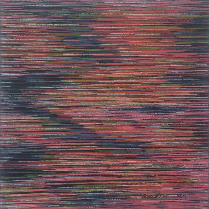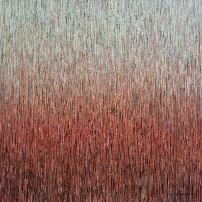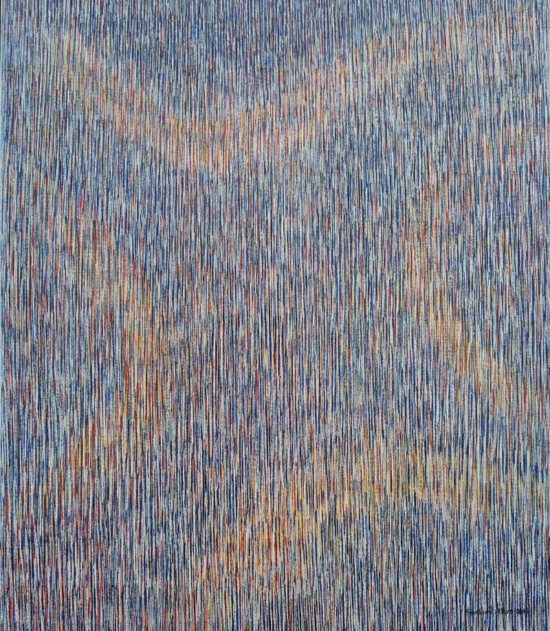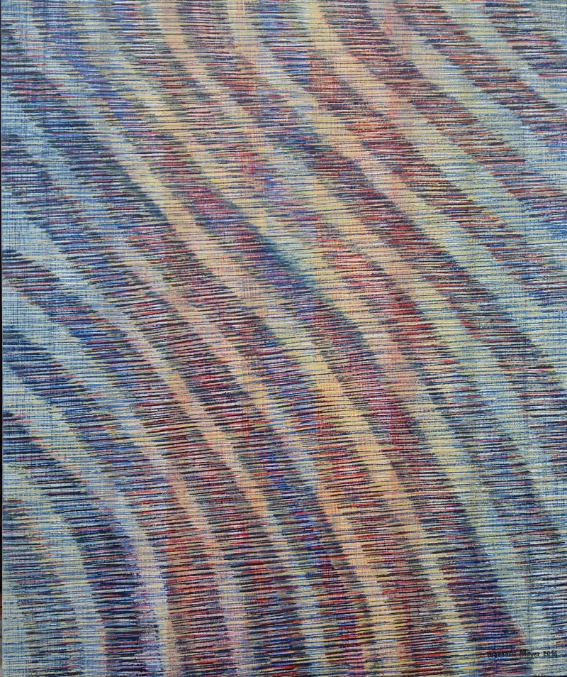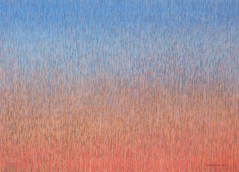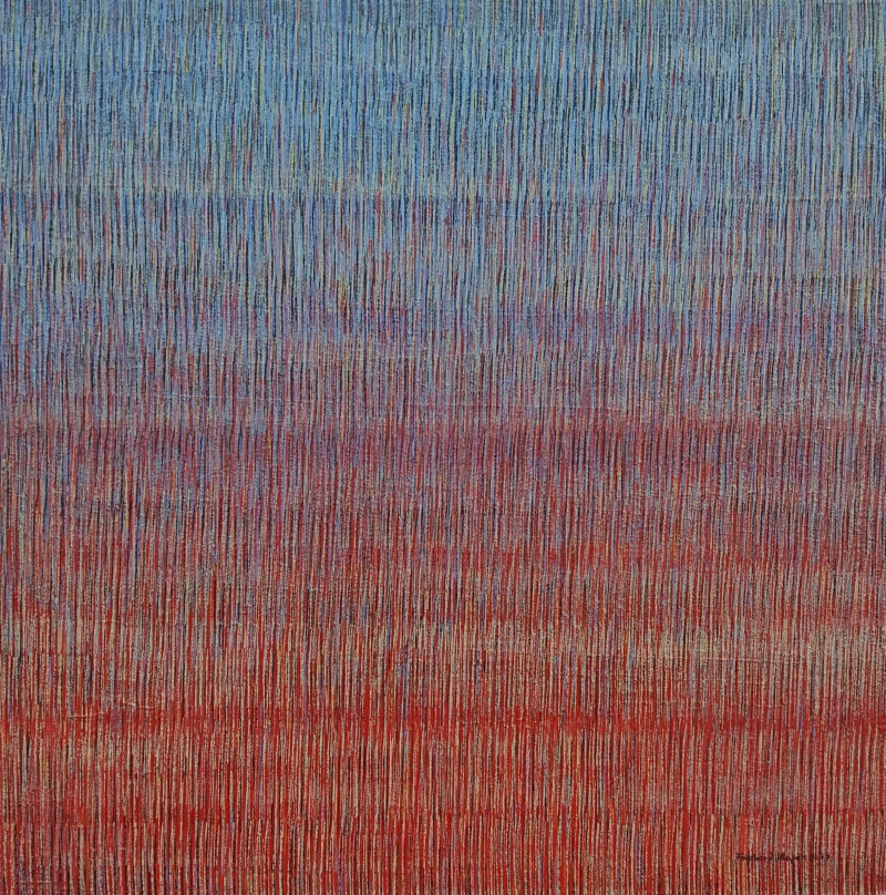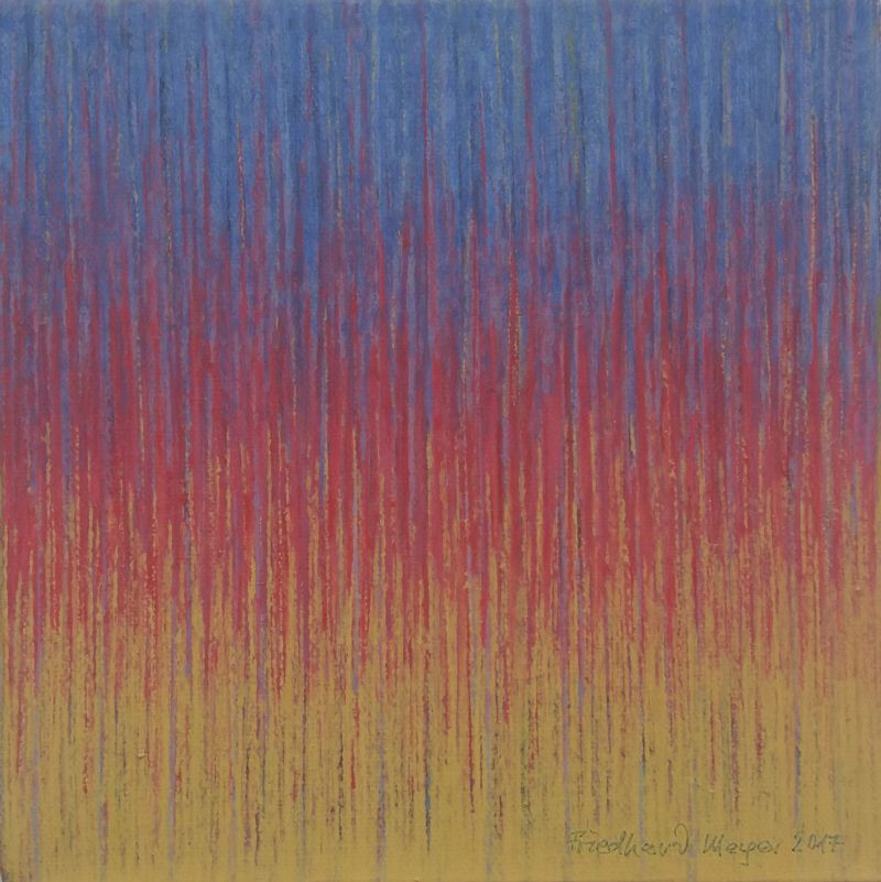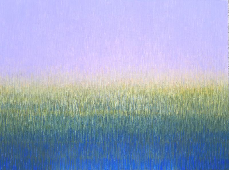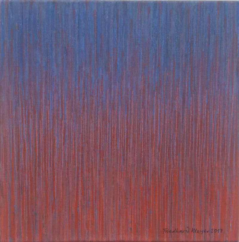 Ich arbeite bei diesen Bildern in meiner selbstentwickelten Acryl-Nadeltechnik, wobei meine Bildflächen einzig durch vertikales Aufsetzen eines 8 cm breiten Flachpinsels erzeugt werden. Das Aufbringen dieser „Nadeln“ erfordert äußerste Konzentration und Präzision.