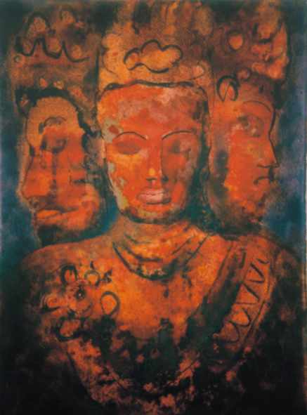 In Mittelindien, im Staat Maharastra stieß ich auf die geheimnisvolle, unermeßlich reiche Götterwelt des Hinduismus, die sich mir in sehr gut erhaltenen Wandmalereien und Plastiken in den mehreren hundert Höhlentempeln von Elephanta, Ajanta und Ellora, unweit von Bombay offenbarte. In der Höhle von Elephanta (Insel im Golf von Bombay) überwältigt die 6 m hohe, einst mit Gold überzogene Großplastik “Trimurti”, die die hinduistische Götterdreiheit: Shiva als Brahma den Schöpfer, als Vishnu den Bewahrer und als Mahesh den Zerstörer darstellt, den Betrachter. Sie gilt als eine der schönsten Schöpfungen indischer Kunst. Die in natürlichen Grotten der Felsenschluchten von Ajanta und Ellora angelegten Höhlentempel, die erst wieder 1880 von James Fergusson aus dem Dickicht befreit wurden, bergen eine unendliche Vielfalt von hinduistischen Götterdarstellungen und liefern ein eindrucksvolles Zeugnis hinduistischer Kultur.