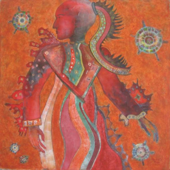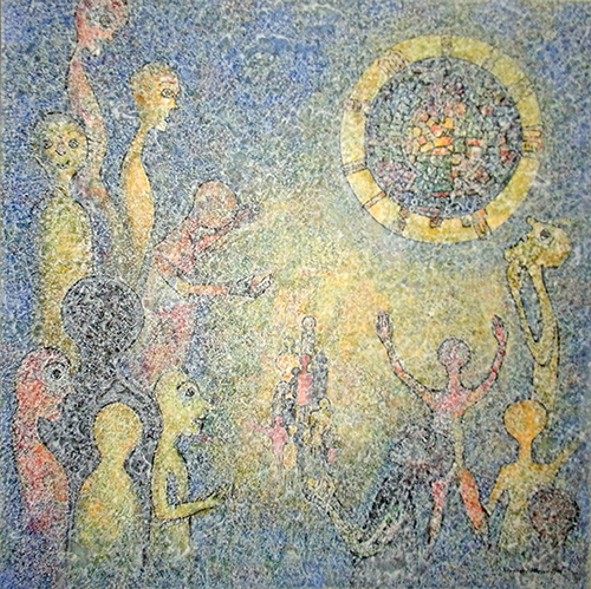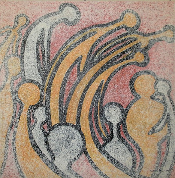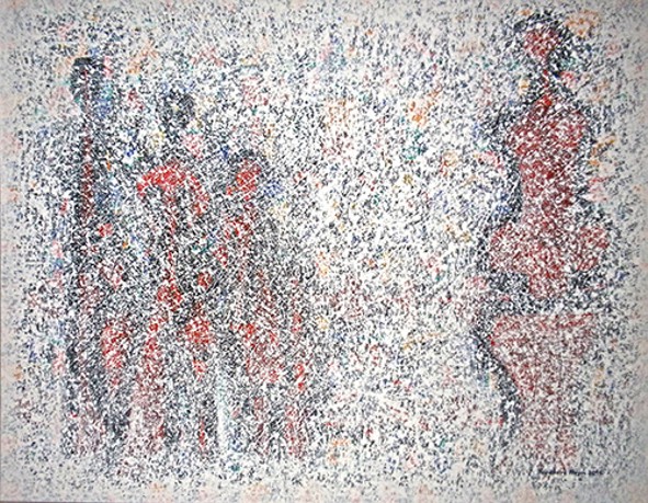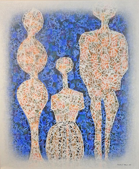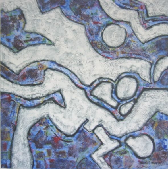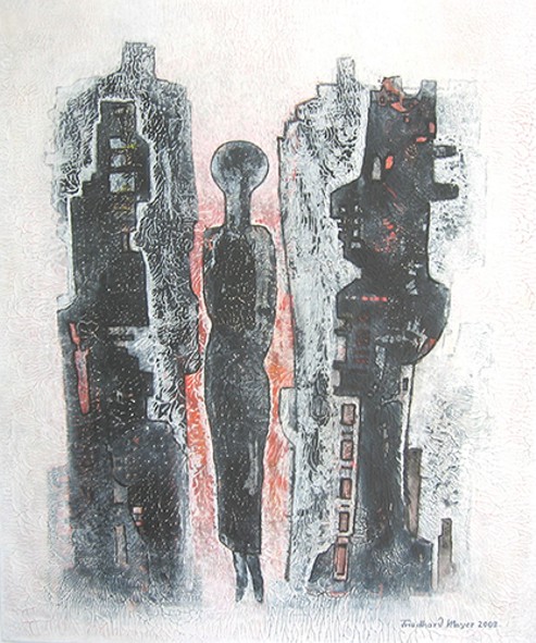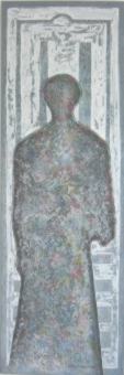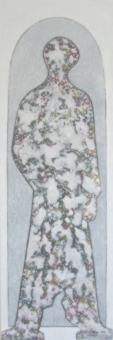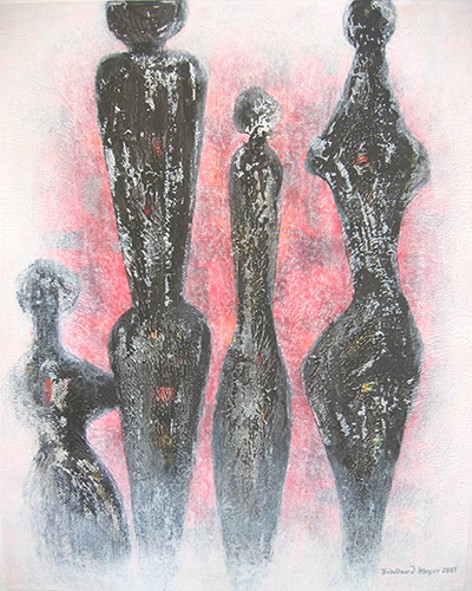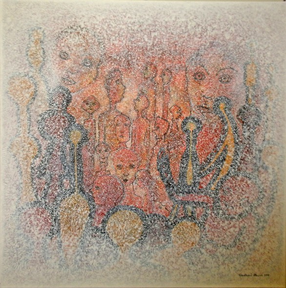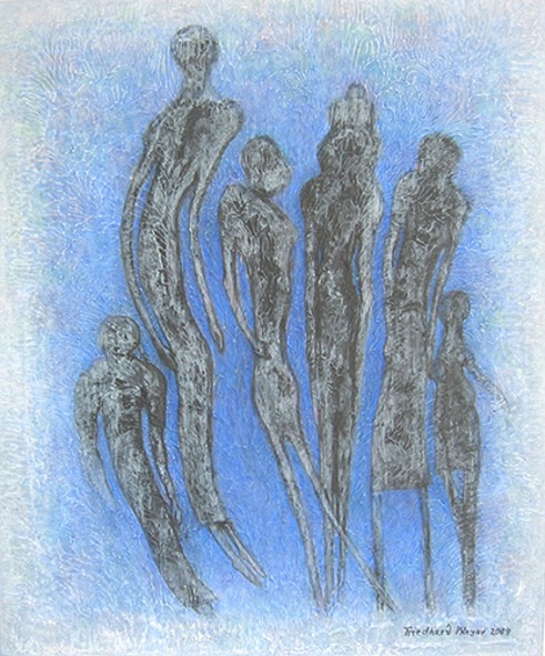Dargestellt in Acryl – oder Acryl – Collage – Technik werden einzelne menschliche Figuren , Figurengruppen oder Gesichter , die oftmals einen Hauch von Ironie , Skurrilität oder Groteske ausstrahlen .