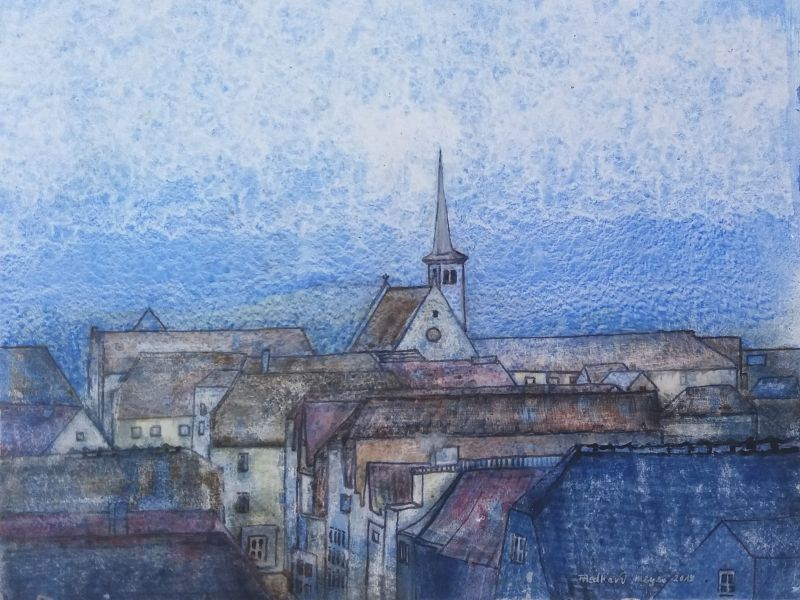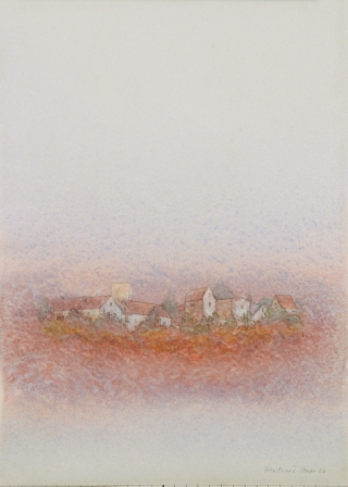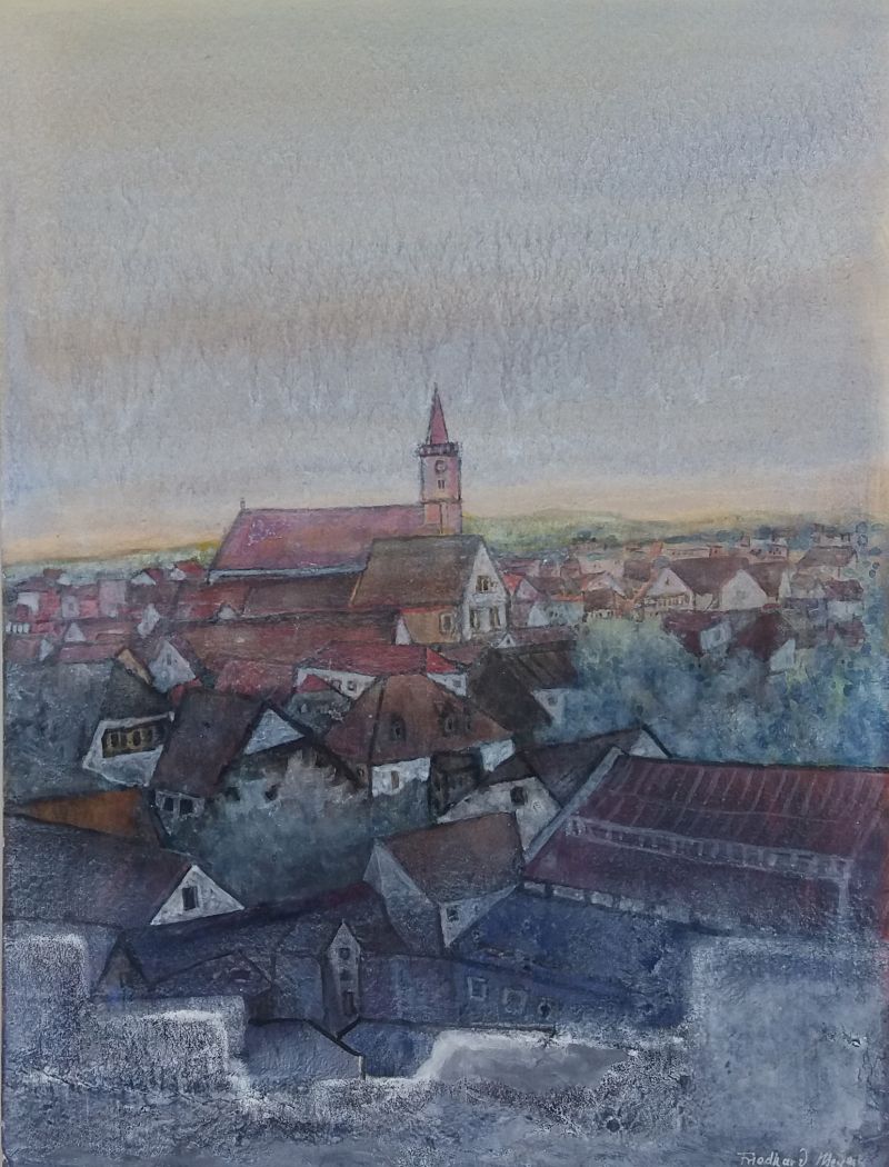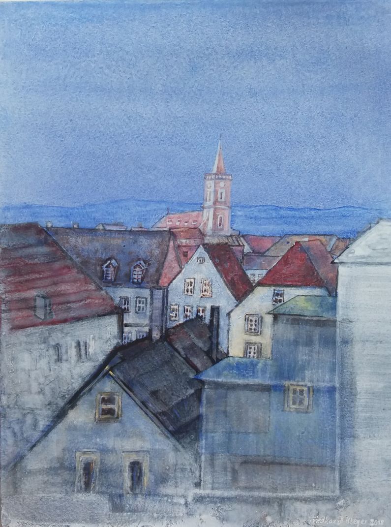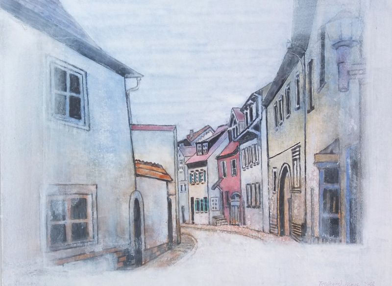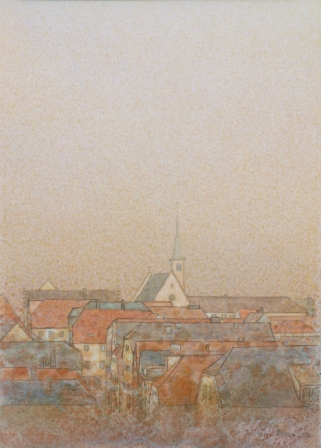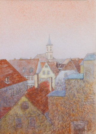 Diese Einblicke und weitere Stadtansichten hielt ich Ende 2004 in einer 20 Kartons umfassenden Aquarellserie fest. Bedingt durch die glatte Oberfläche des Plakatkartons erscheinen die Aquarellfarben gedämpft, leise und zurückhaltend. Die Fassaden, Gebäude und Dächer tauchen oft gespenstisch aus sanftem Lichtnebel auf.