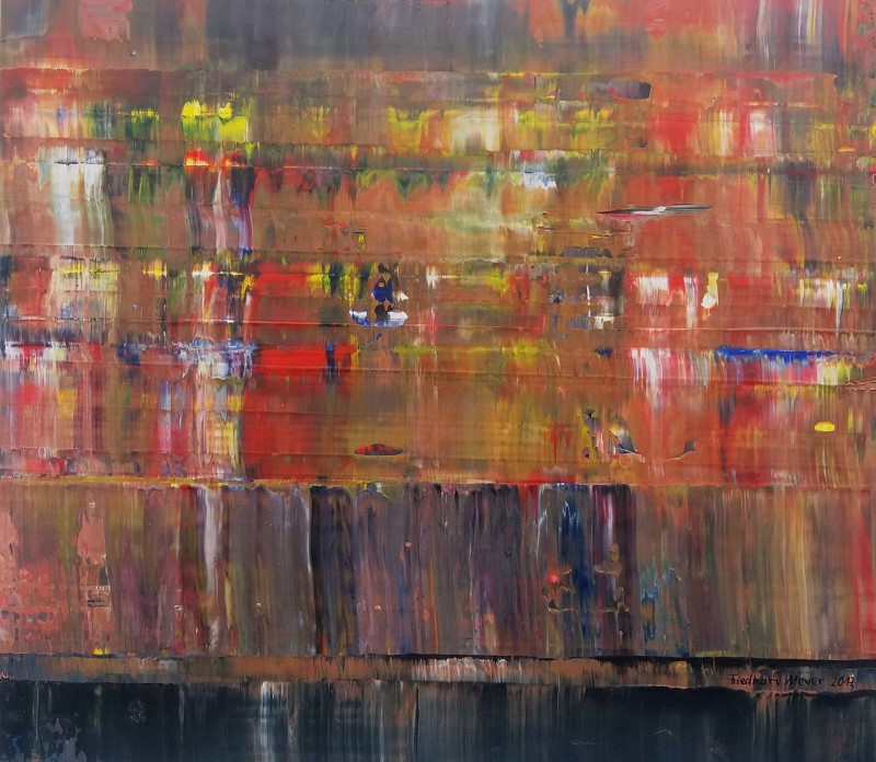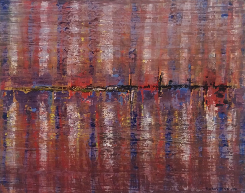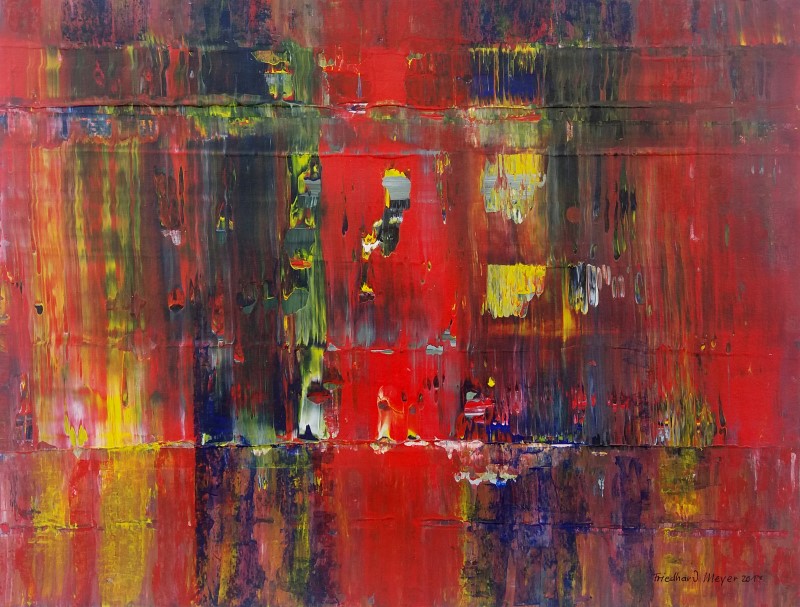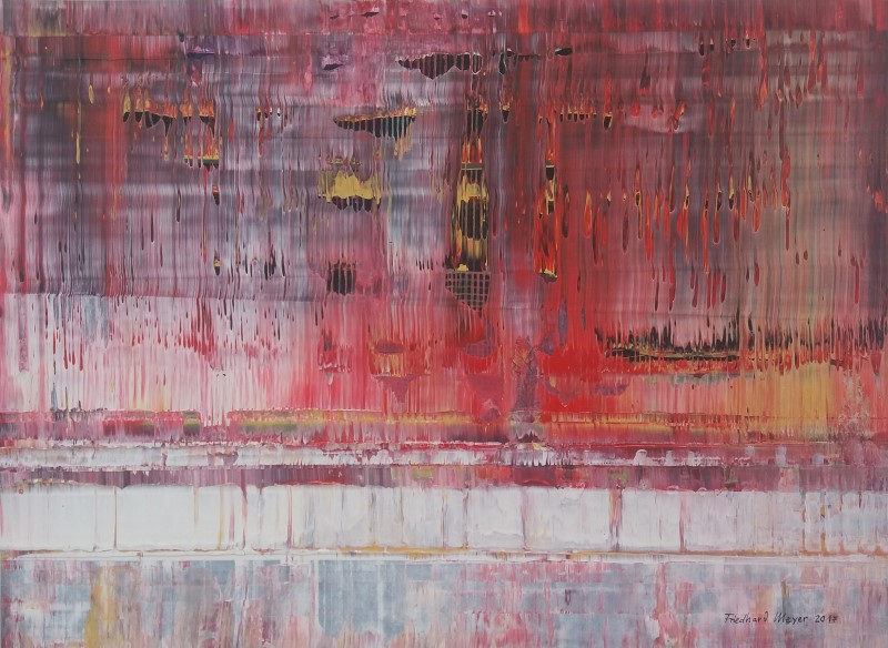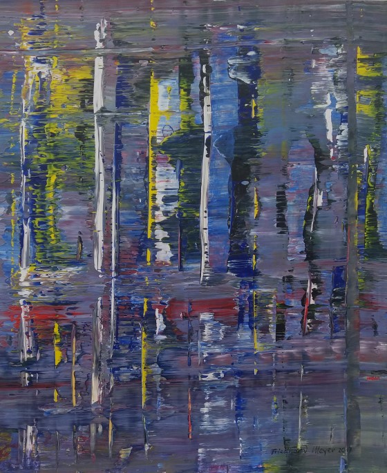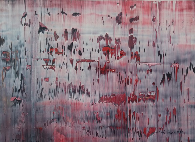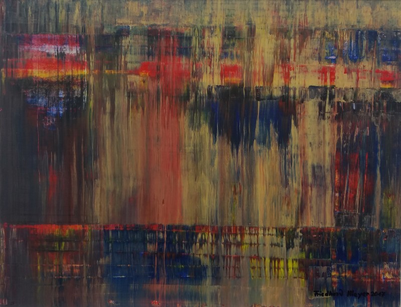 Seit 1993 beschäftige ich mich mit großformatigen Abstraktionen. Dabei werden dünnflüssige Acrylfarben durch Träufeln, Gießen oder Schütten auf den Bildträger aufgebracht. Die Bildgestaltung wird bei diesen Bildern nicht einseitig von der vorgegebenen und unverrückbaren Bildidee erzwungen. Vielmehr stehen Bildidee und Bildgestaltung in gegenseitiger Abhängigkeit. Während des Arbeitsprozesses entstehen z.B. neue Bildideen, die dann durch geeignete Farb- und Formwahl im weiteren Arbeitsverlauf realisiert werden. Die Entstehung des Bildes vollzieht sich sozusagen in einer stufenweise fortschreitenden Wechselwirkung zwischen Bildgestaltung und Bildidee. In jüngerer Zeit entstehen diese Bilder in der Technik „Die Farbe Weiß", ab 2013 vornehmlich in Acryl-Rakeltechnik.
