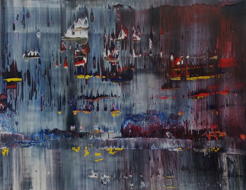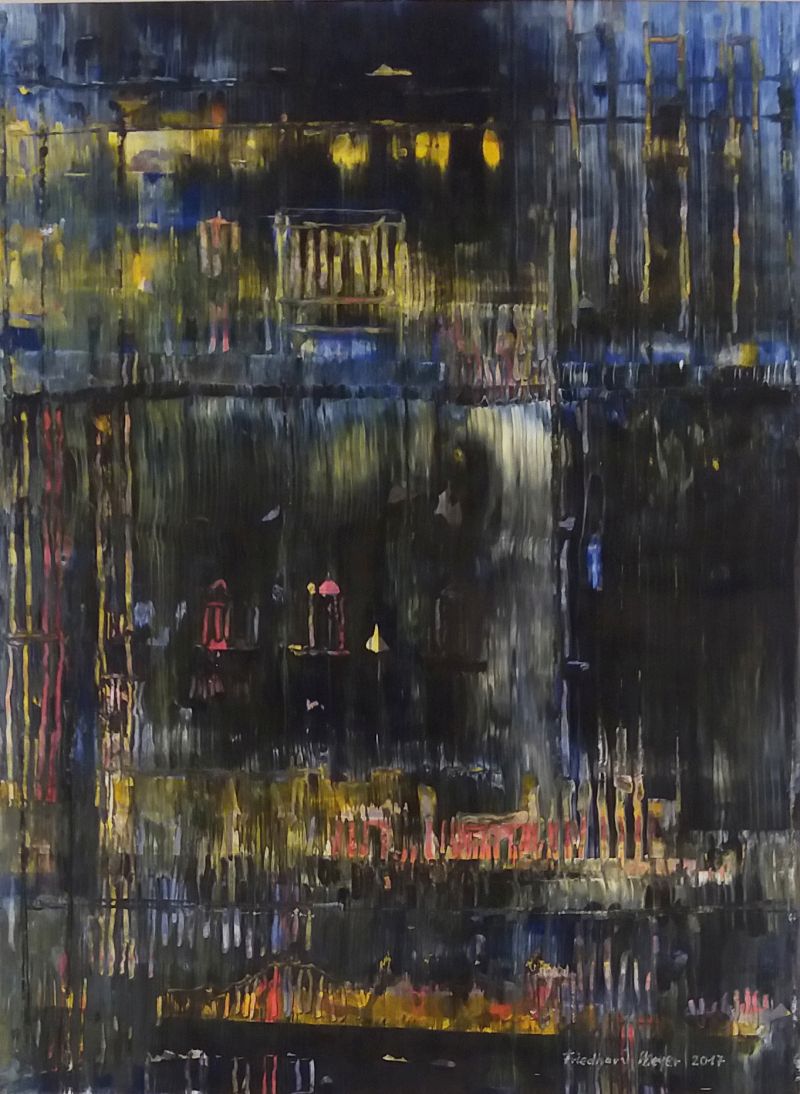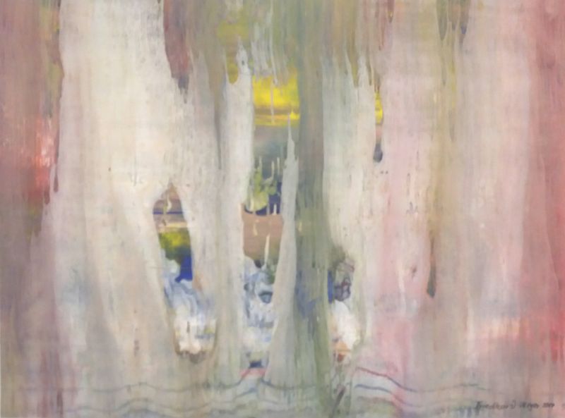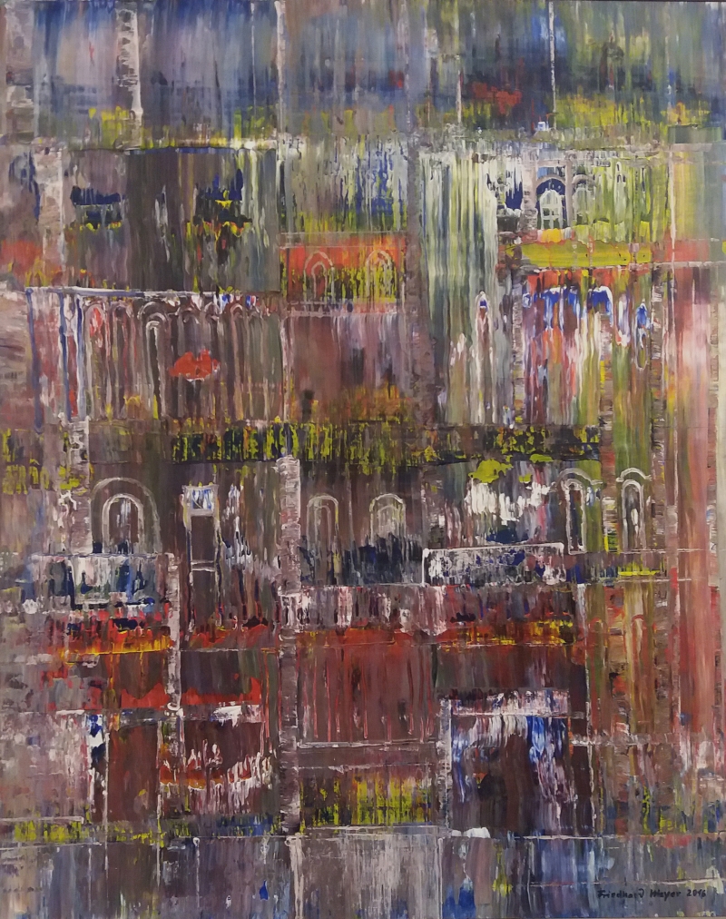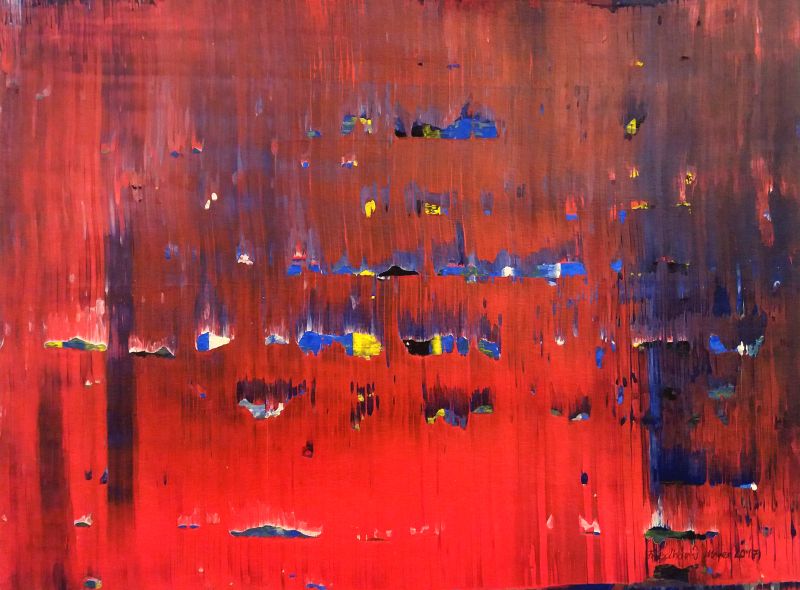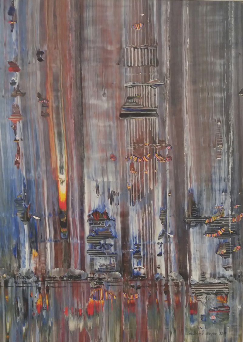 Seit 1993 beschäftige ich mich mit großformatigen Abstraktionen. Dabei werden dünnflüssige Acrylfarben durch Träufeln, Gießen oder Schütten auf den Bildträger aufgebracht. Die Bildgestaltung wird bei diesen Bildern nicht einseitig von der vorgegebenen und unverrückbaren Bildidee erzwungen. Vielmehr stehen Bildidee und Bildgestaltung in gegenseitiger Abhängigkeit. Während des Arbeitsprozesses entstehen z.B. neue Bildideen, die dann durch geeignete Farb- und Formwahl im weiteren Arbeitsverlauf realisiert werden. Die Entstehung des Bildes vollzieht sich sozusagen in einer stufenweise fortschreitenden Wechselwirkung zwischen Bildgestaltung und Bildidee. In jüngerer Zeit entstehen diese Bilder in der Technik „Die Farbe Weiß", ab 2013 vornehmlich in Acryl-Rakeltechnik.