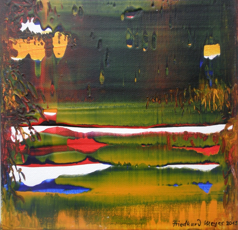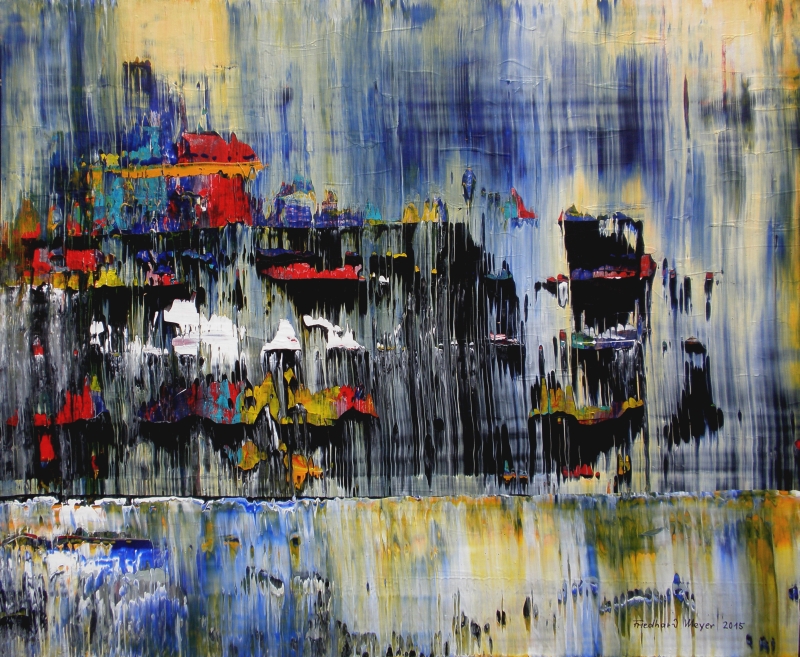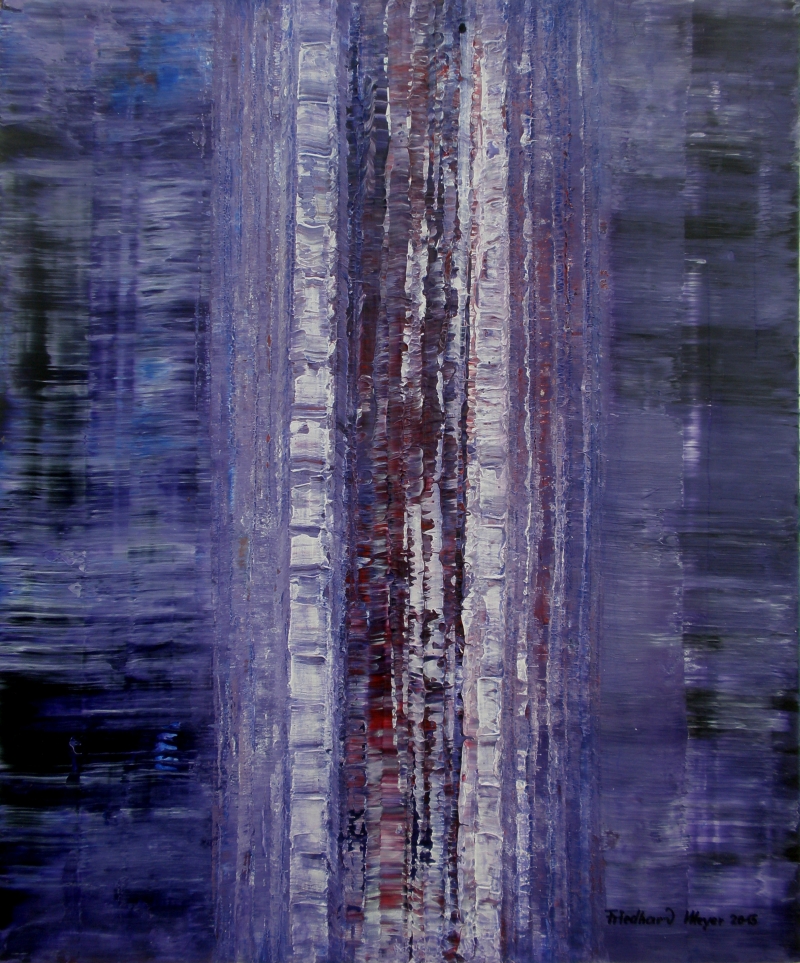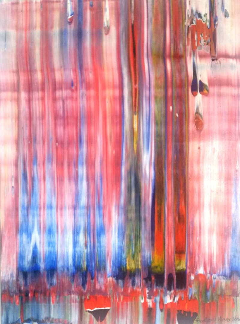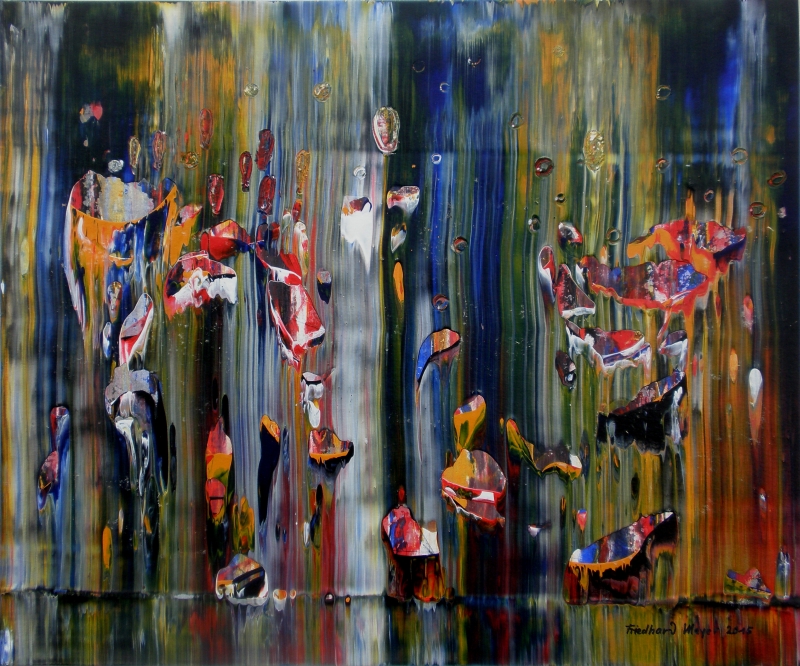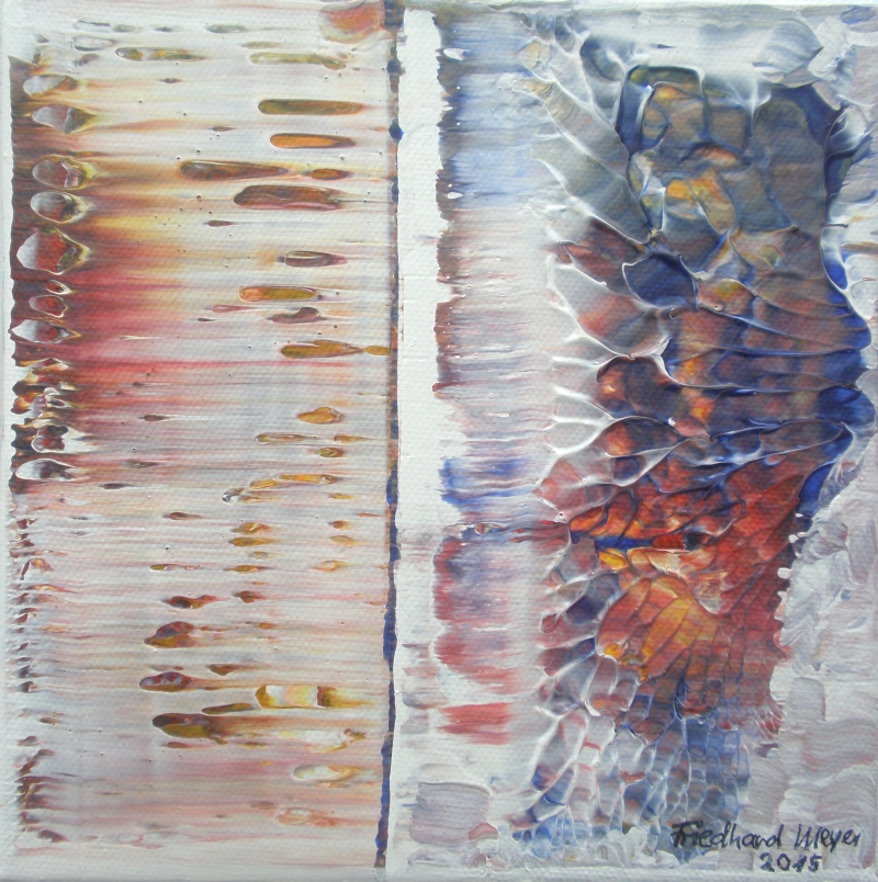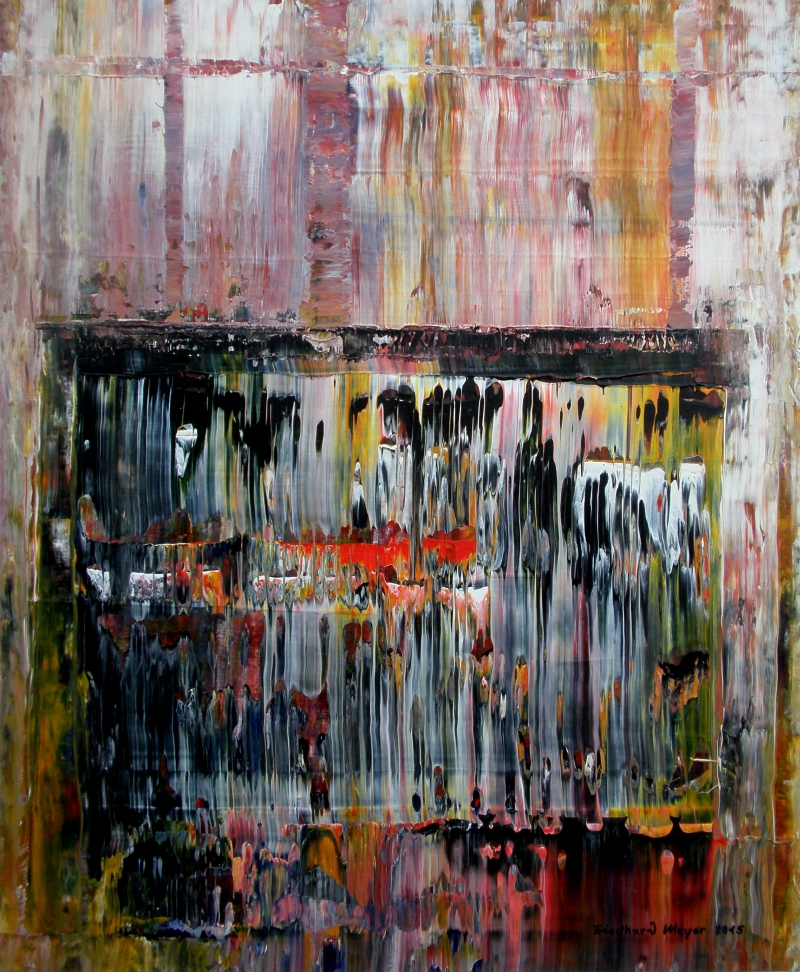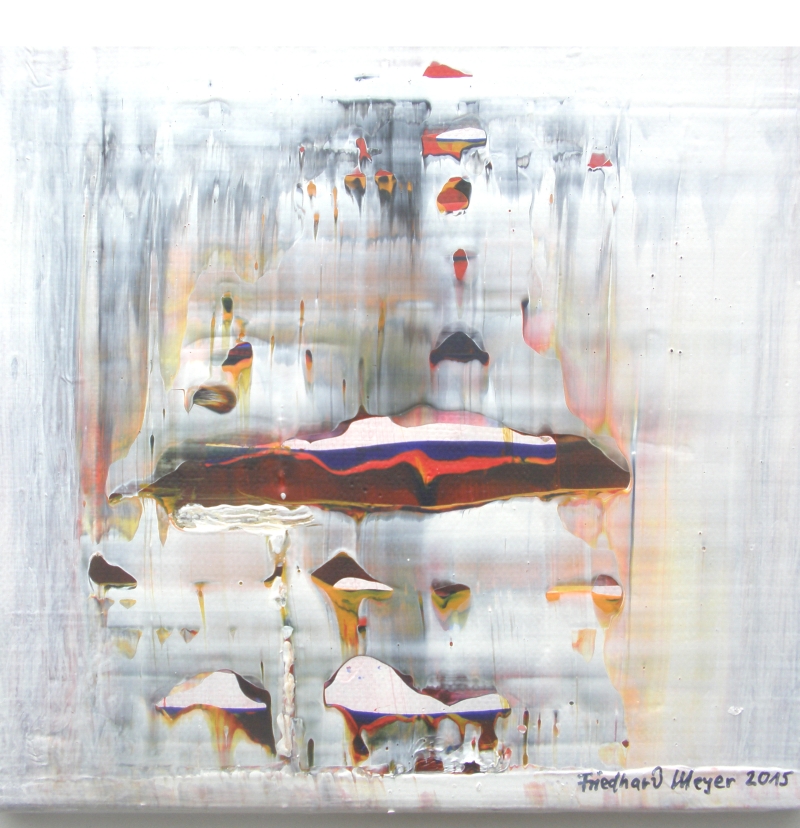 Seit 1993 beschäftige ich mich mit großformatigen Abstraktionen. Dabei werden dünnflüssige Acrylfarben durch Träufeln, Gießen oder Schütten auf den Bildträger aufgebracht. Die Bildgestaltung wird bei diesen Bildern nicht einseitig von der vorgegebenen und unverrückbaren Bildidee erzwungen. Vielmehr stehen Bildidee und Bildgestaltung in gegenseitiger Abhängigkeit. Während des Arbeitsprozesses entstehen z.B. neue Bildideen, die dann durch geeignete Farb- und Formwahl im weiteren Arbeitsverlauf realisiert werden. Die Entstehung des Bildes vollzieht sich sozusagen in einer stufenweise fortschreitenden Wechselwirkung zwischen Bildgestaltung und Bildidee. In jüngerer Zeit entstehen diese Bilder in der Technik „Die Farbe Weiß", ab 2013 vornehmlich in Acryl-Rakeltechnik.