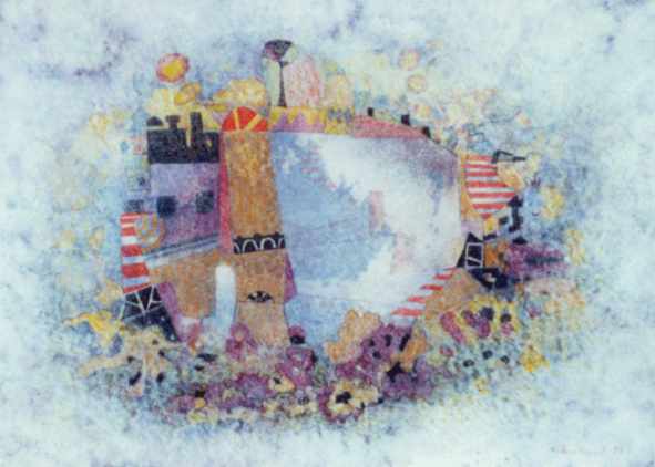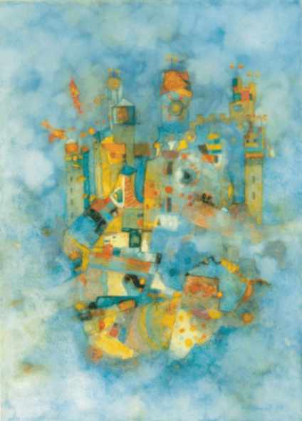 Die Bilder werden zunächst in Ölkreide angelegt, wobei das graphische Element eine dominante Rolle spielt, und dann großzügig, dünnflüssig, aquarellartig mit Acrylfarbe (ohne Rücksicht auf die darunterliegende Ölkreide) übermalt. Die massive, fetthaltige Ölkreide verdrängt dann während des Trocknungsprozesses partiell (je nach Dosierung) die wasserlösliche Acrylfarbe und das Bild “kristallisiert” sich mit fortschreitender Zeit nach und nach heraus.