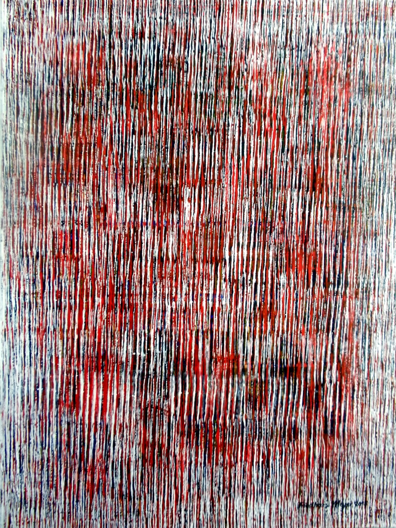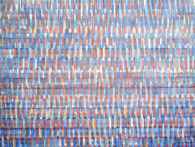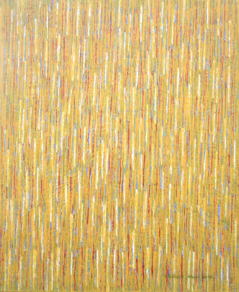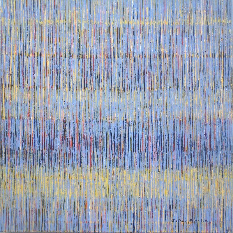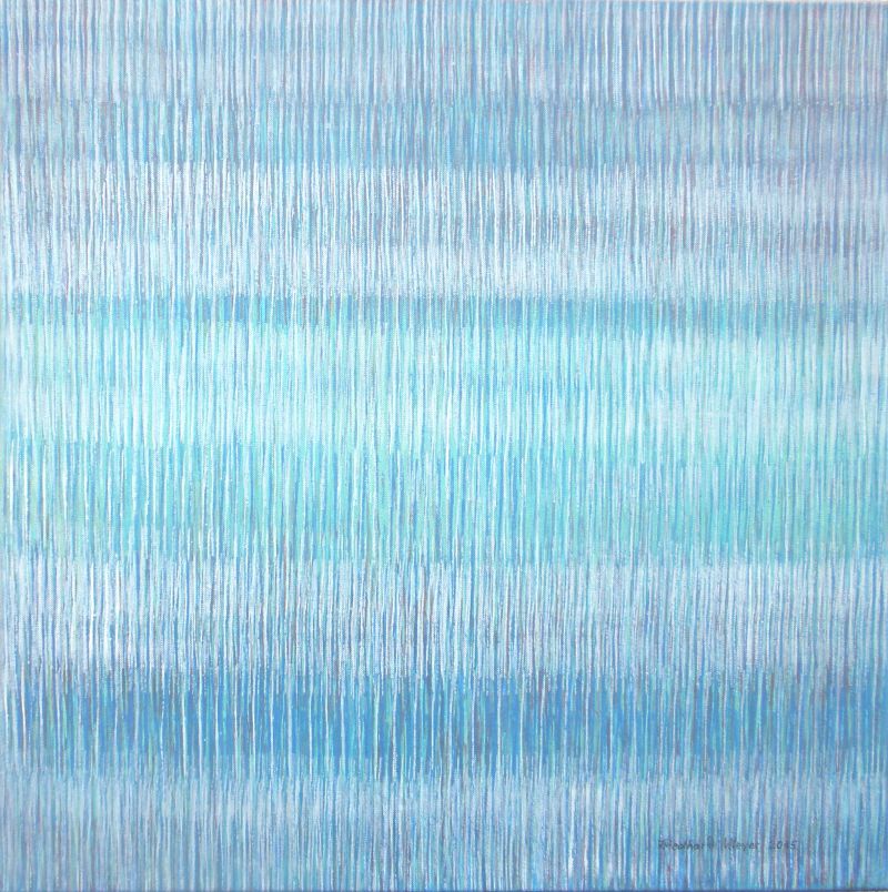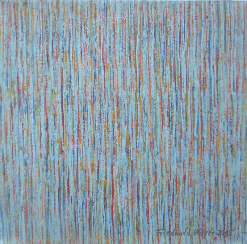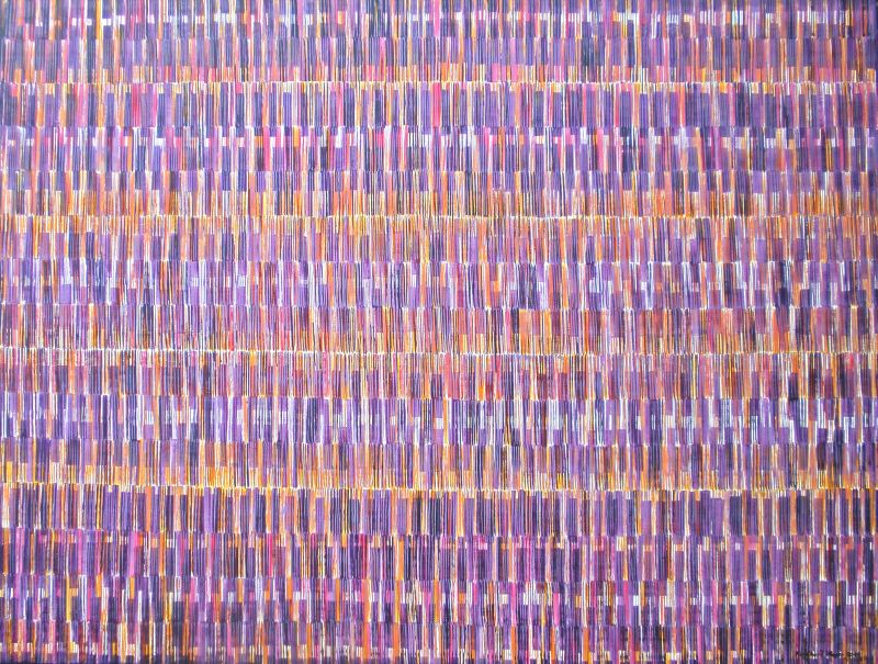 Ich arbeite bei diesen Bildern in meiner selbstentwickelten Acryl-Nadeltechnik, wobei meine Bildflächen einzig durch vertikales Aufsetzen eines 8 cm breiten Flachpinsels erzeugt werden. Das Aufbringen dieser „Nadeln“ erfordert äußerste Konzentration und Präzision.