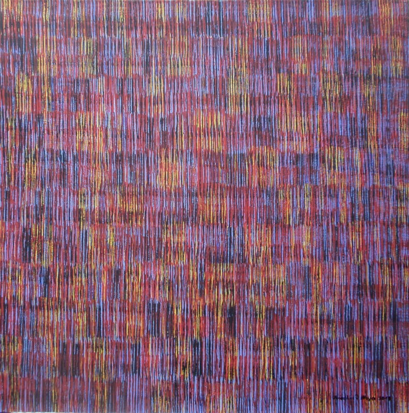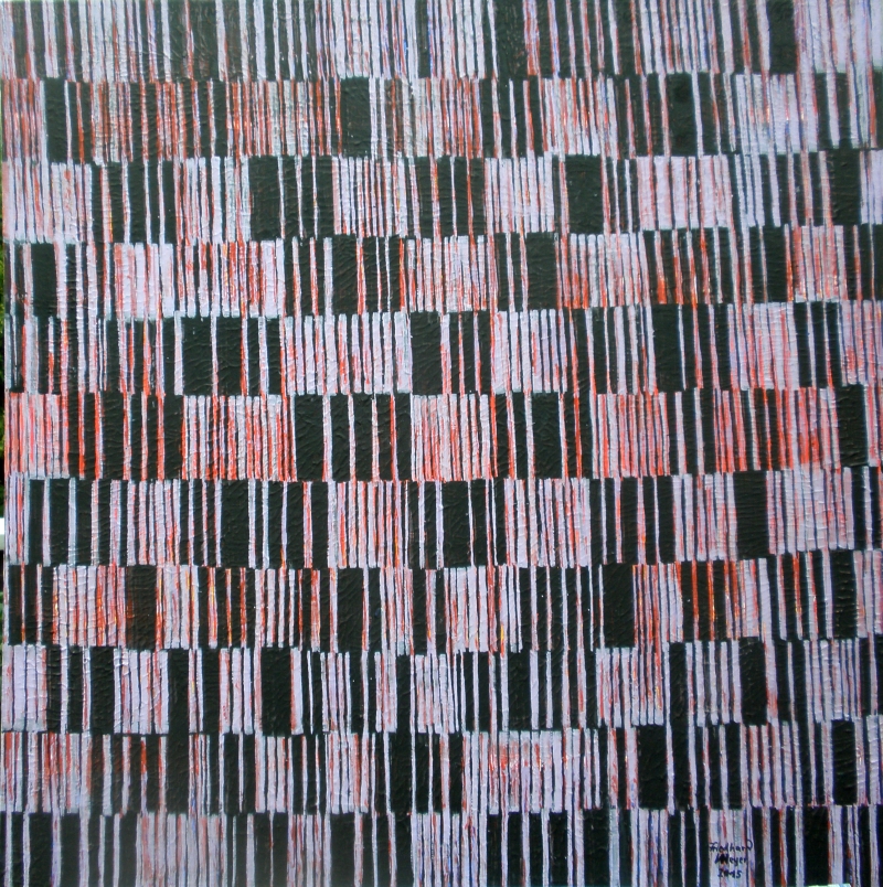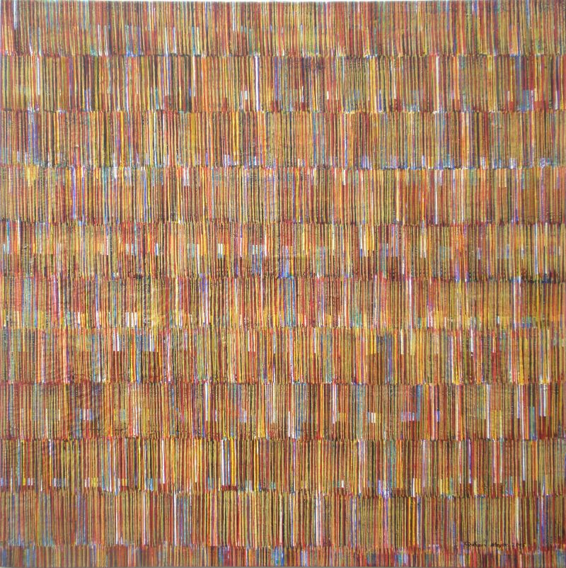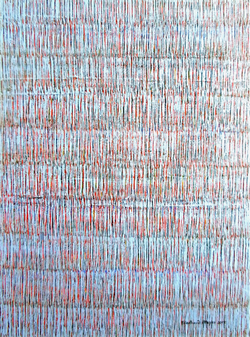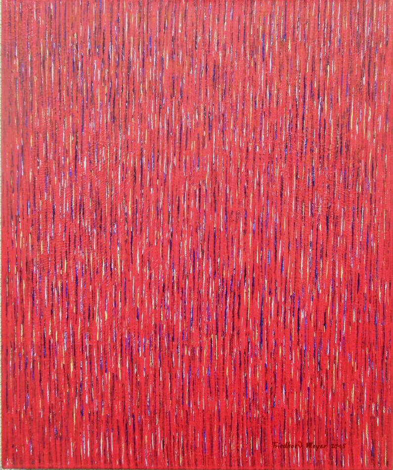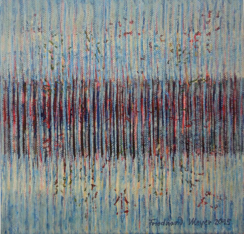 Ich arbeite bei diesen Bildern in meiner selbstentwickelten Acryl-Nadeltechnik, wobei meine Bildflächen einzig durch vertikales Aufsetzen eines 8 cm breiten Flachpinsels erzeugt werden. Das Aufbringen dieser „Nadeln“ erfordert äußerste Konzentration und Präzision.