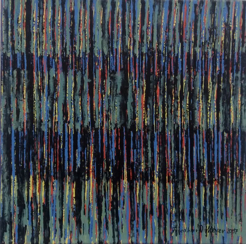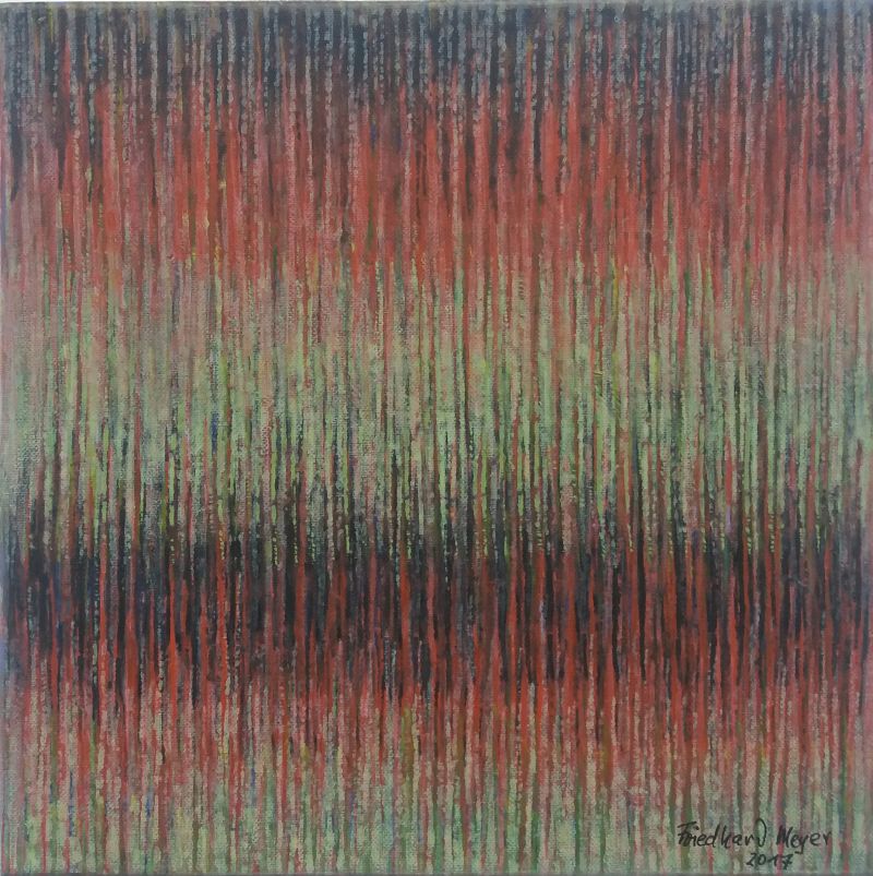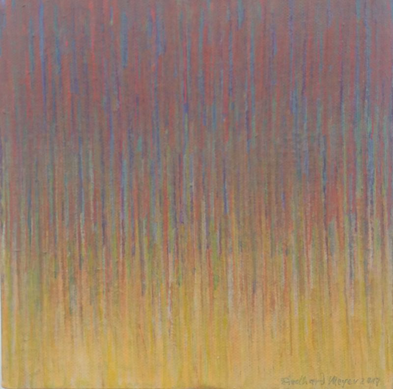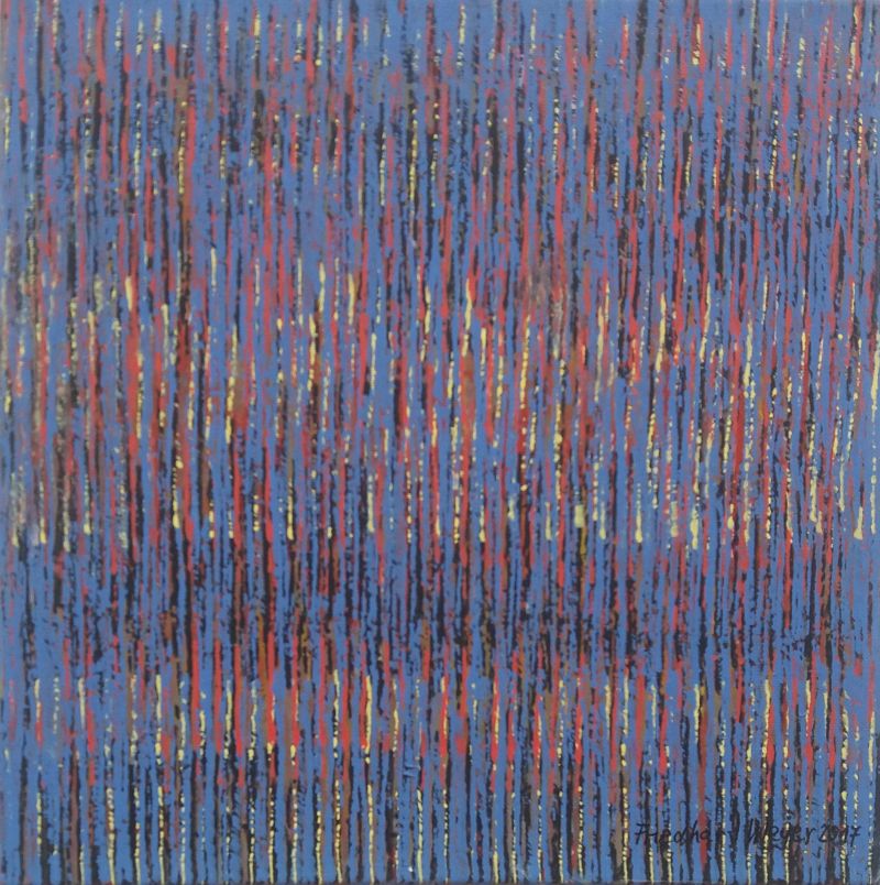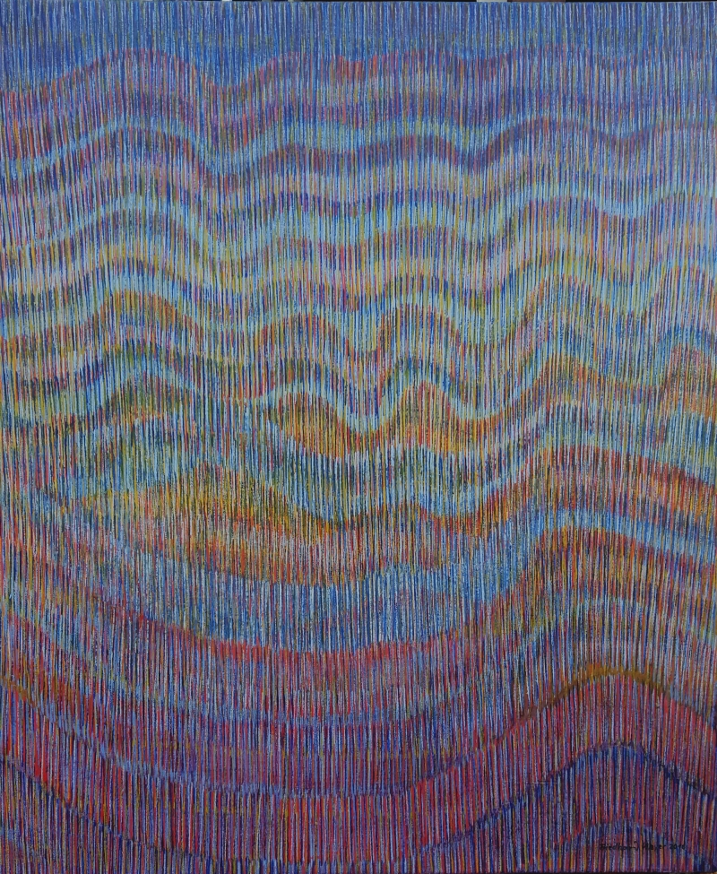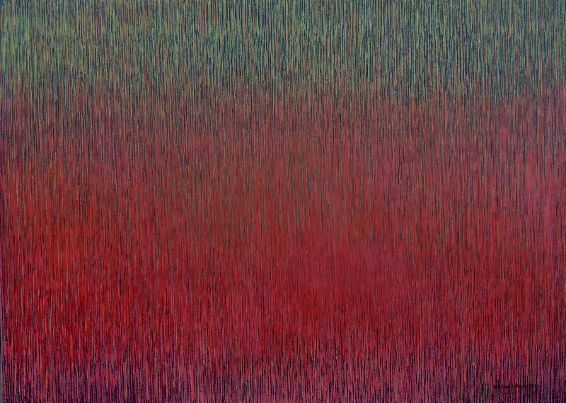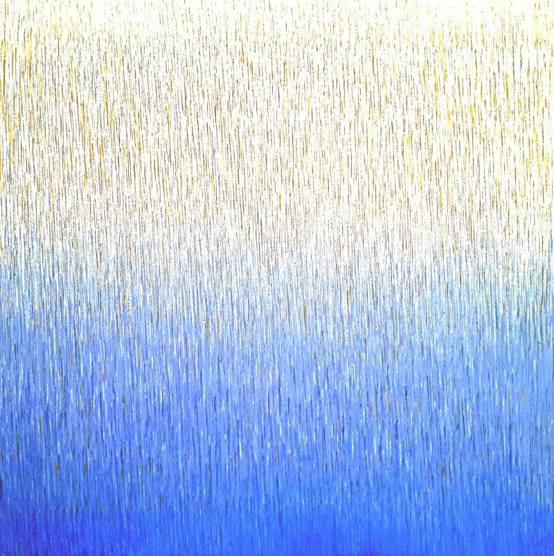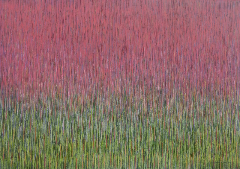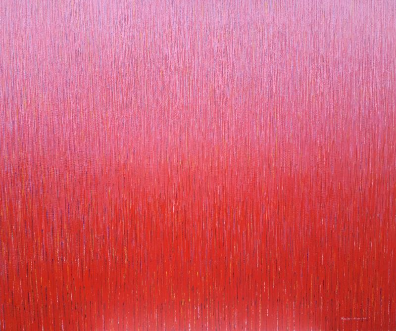 Ich arbeite bei diesen Bildern in meiner selbstentwickelten Acryl-Nadeltechnik, wobei meine Bildflächen einzig durch vertikales Aufsetzen eines 8 cm breiten Flachpinsels erzeugt werden. Das Aufbringen dieser „Nadeln“ erfordert äußerste Konzentration und Präzision.