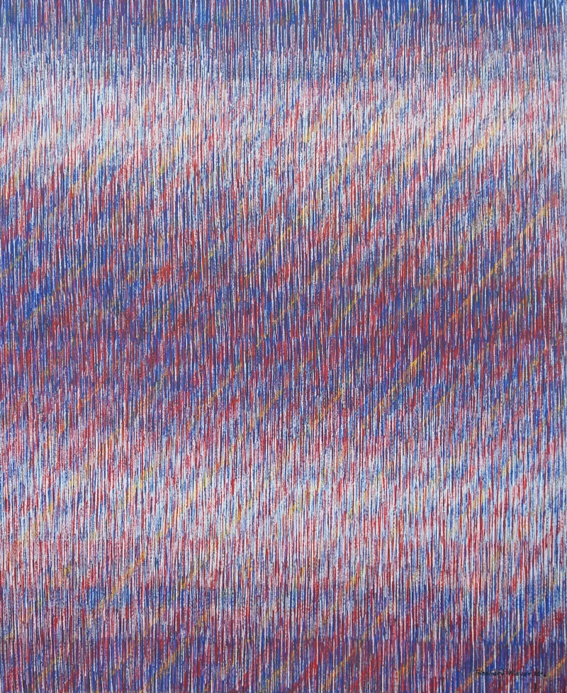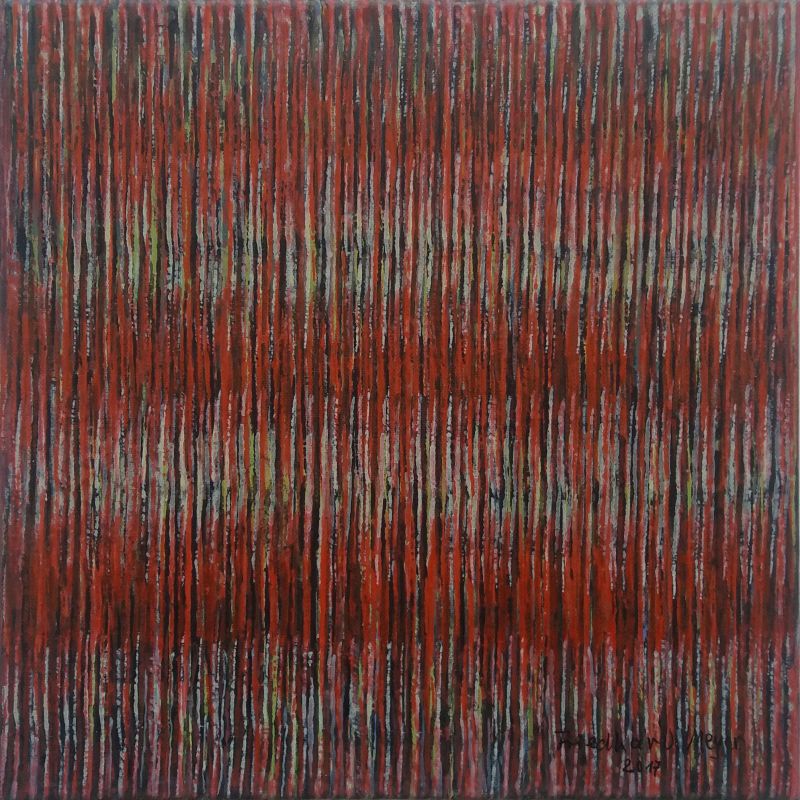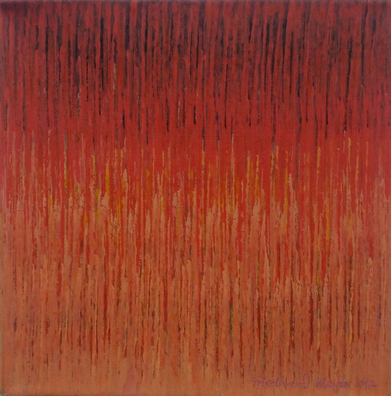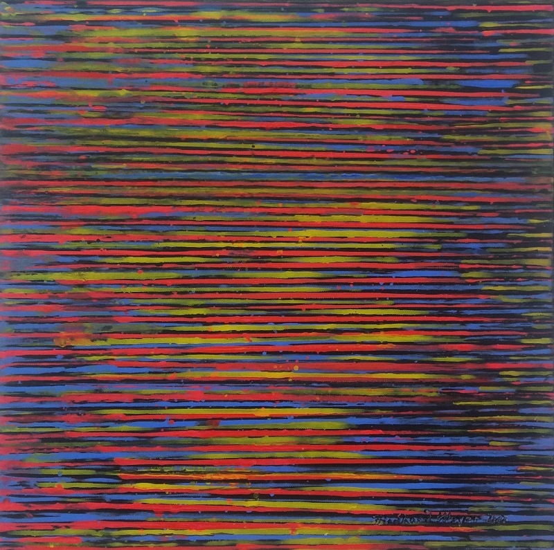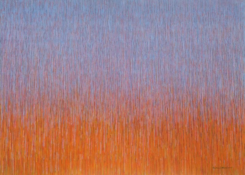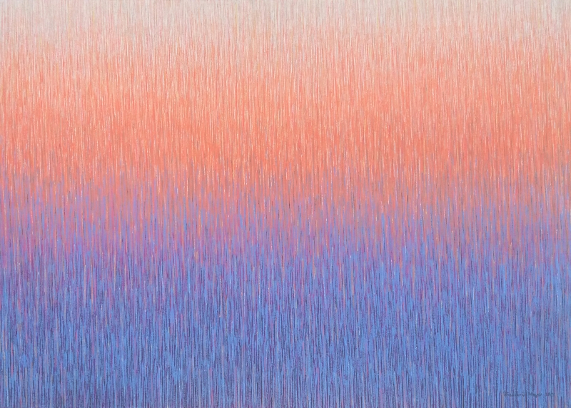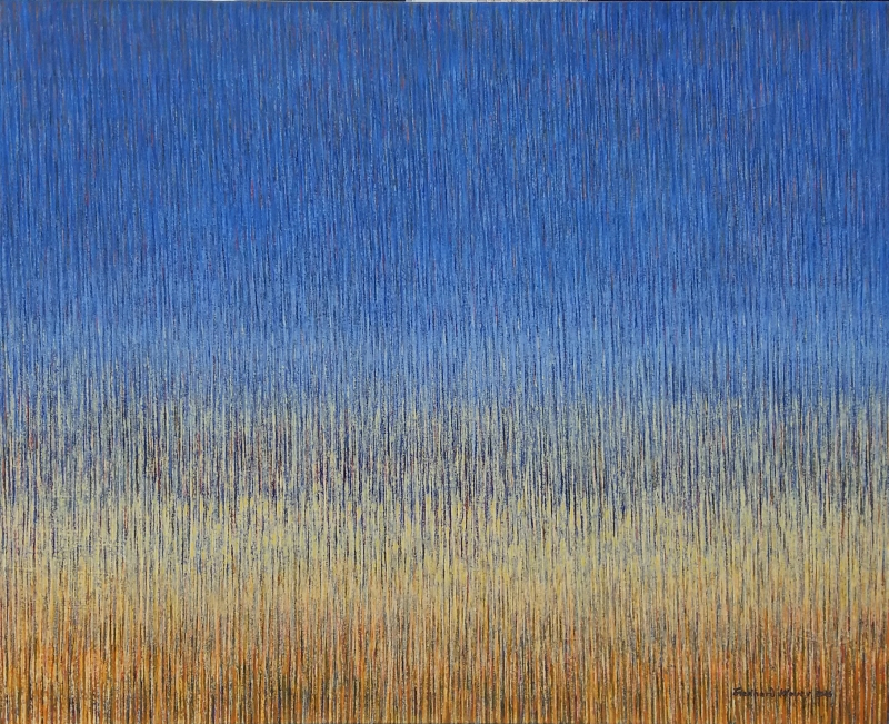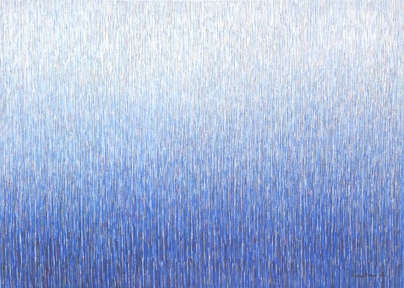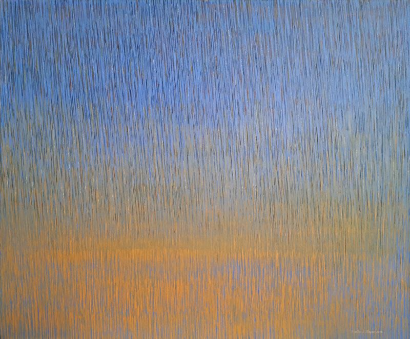 Ich arbeite bei diesen Bildern in meiner selbstentwickelten Acryl-Nadeltechnik, wobei meine Bildflächen einzig durch vertikales Aufsetzen eines 8 cm breiten Flachpinsels erzeugt werden. Das Aufbringen dieser „Nadeln“ erfordert äußerste Konzentration und Präzision.