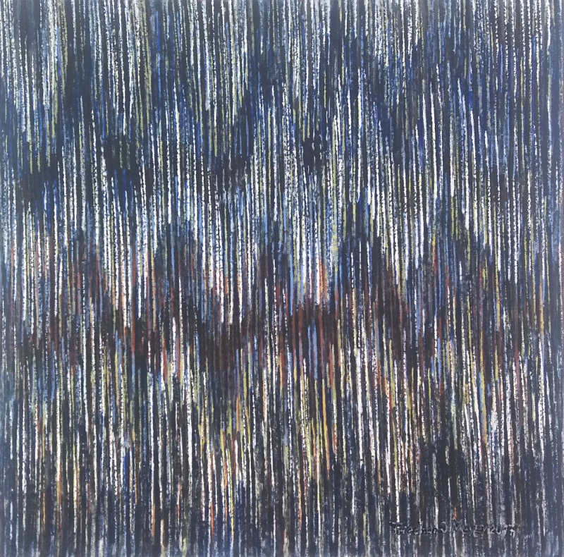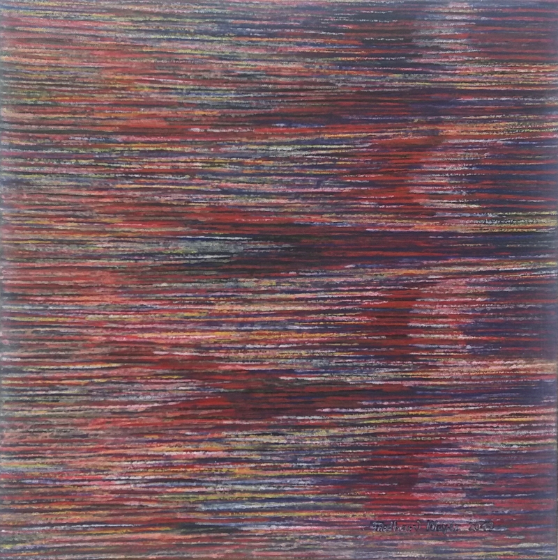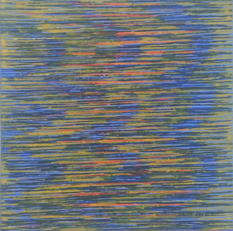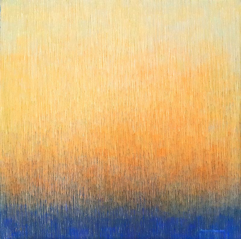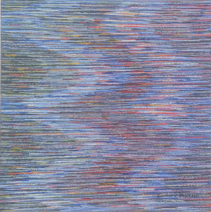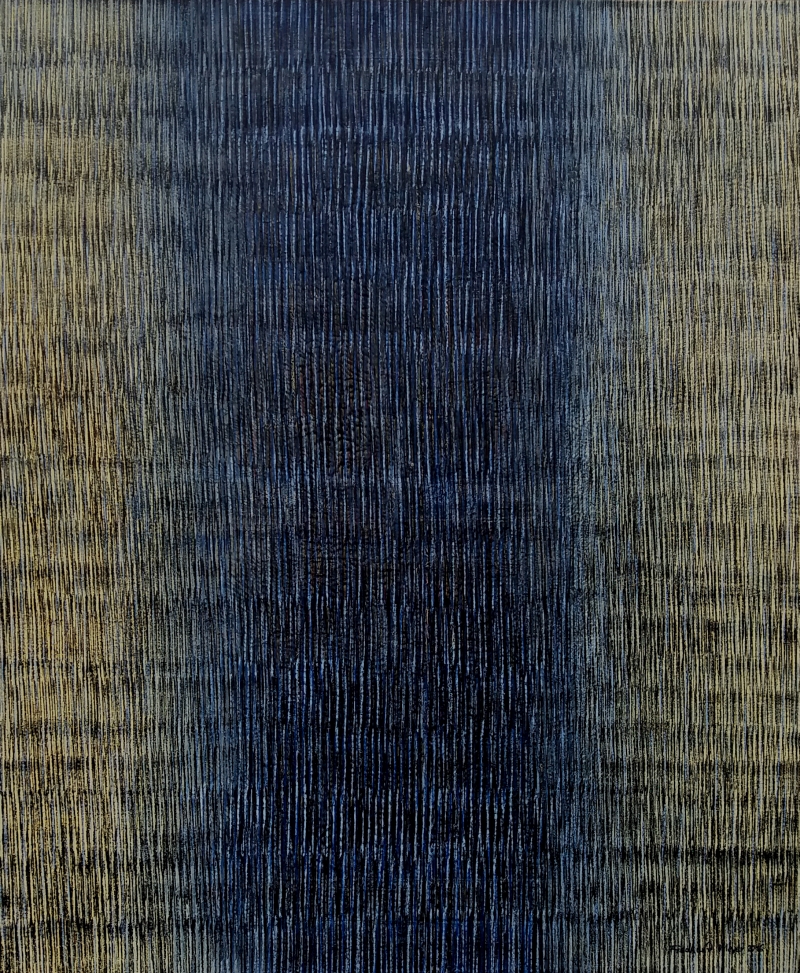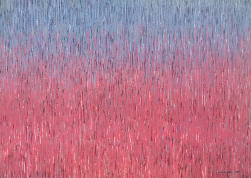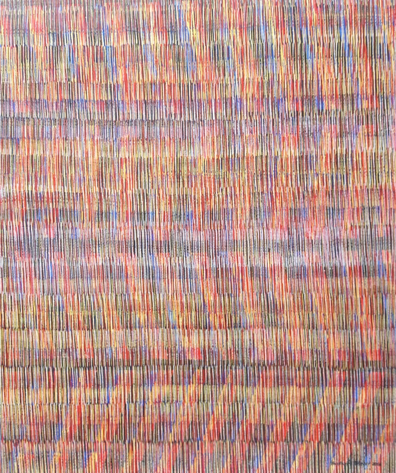 Ich arbeite bei diesen Bildern in meiner selbstentwickelten Acryl-Nadeltechnik, wobei meine Bildflächen einzig durch vertikales Aufsetzen eines 8 cm breiten Flachpinsels erzeugt werden. Das Aufbringen dieser „Nadeln“ erfordert äußerste Konzentration und Präzision.